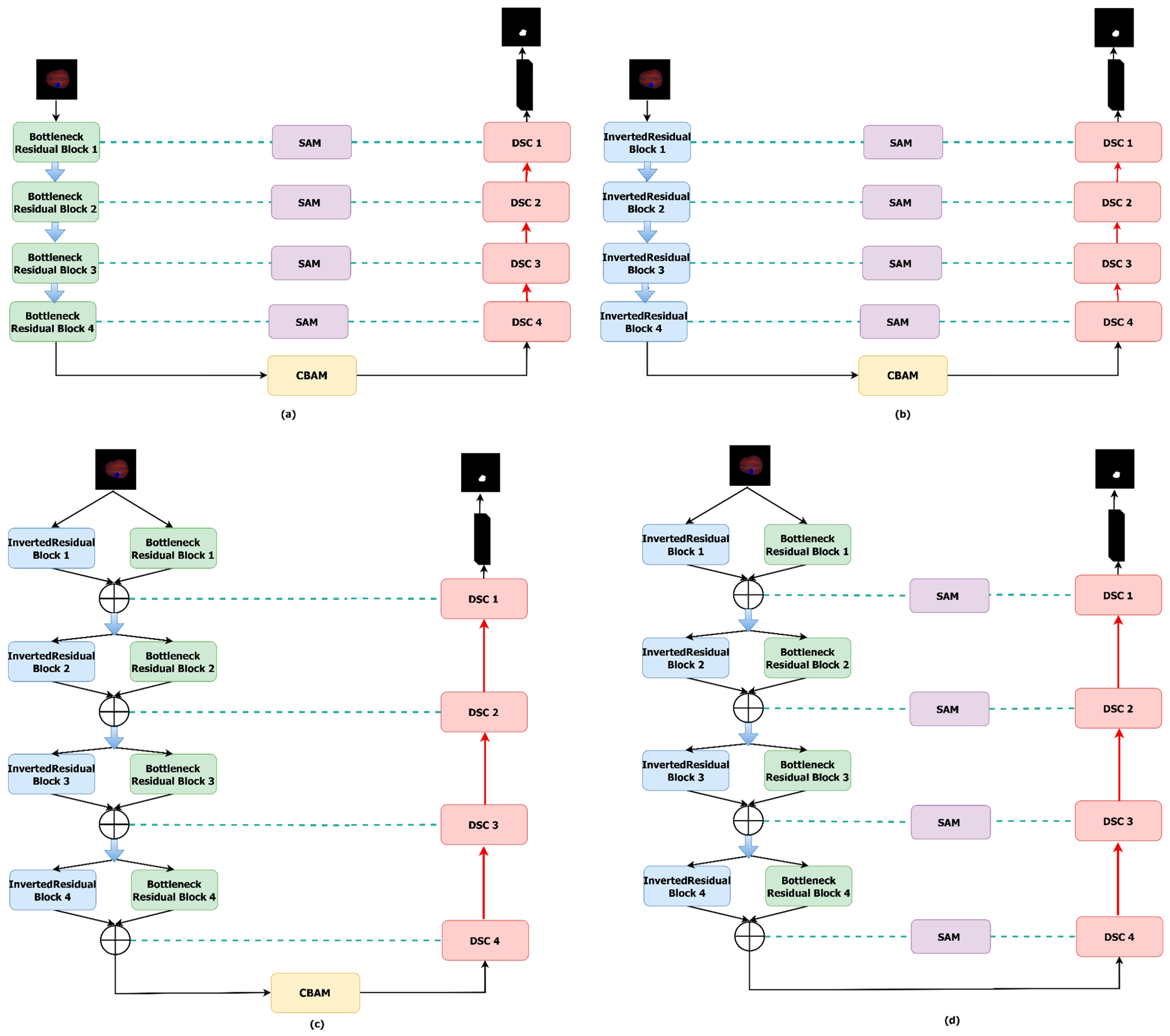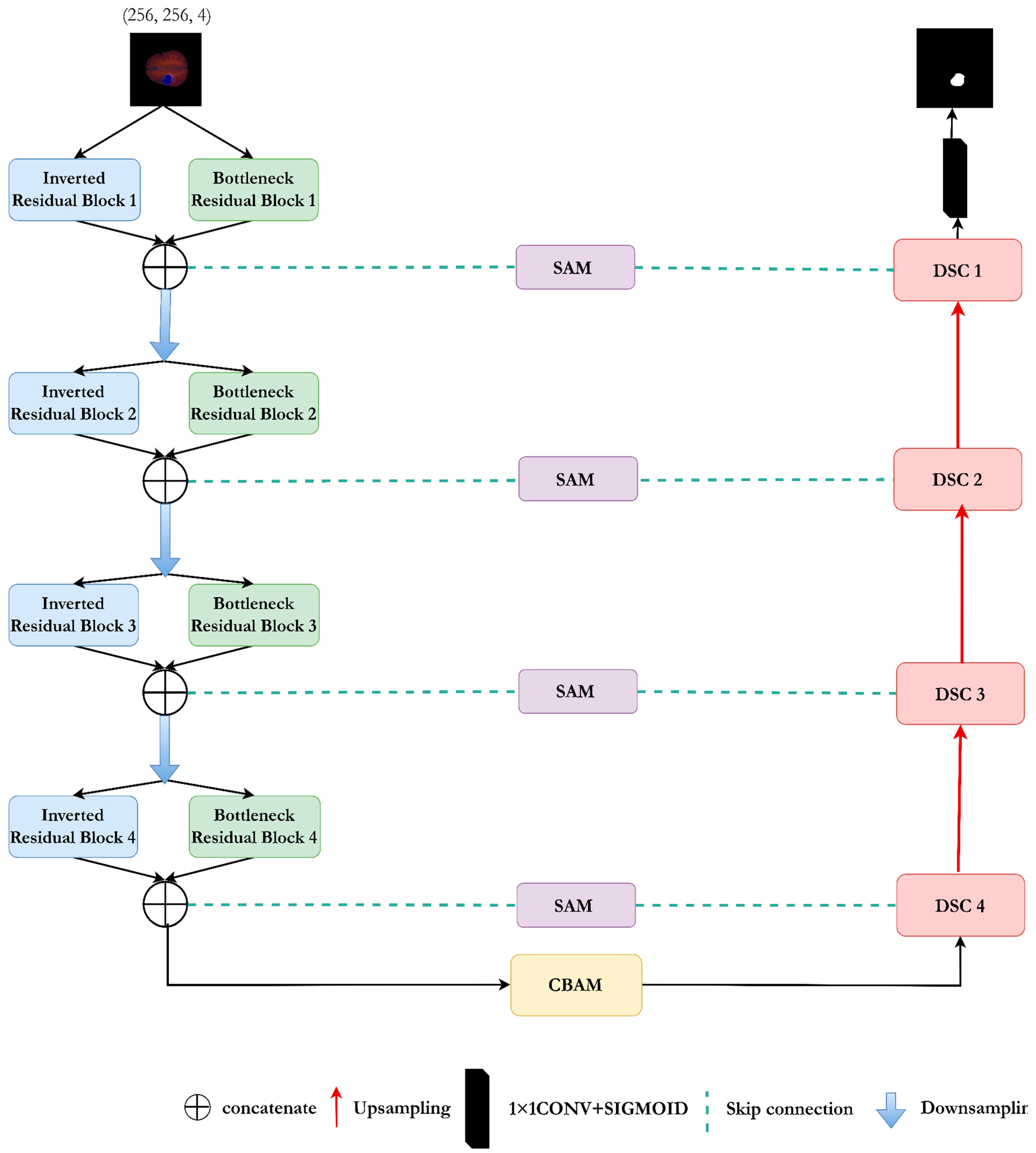 - Improving computational efficiency: The encoder employs bottleneck residual blocks and inverted residual blocks, carefully balancing model performance with computational requirements, thus enabling efficient segmentation suitable for clinical real-time use.