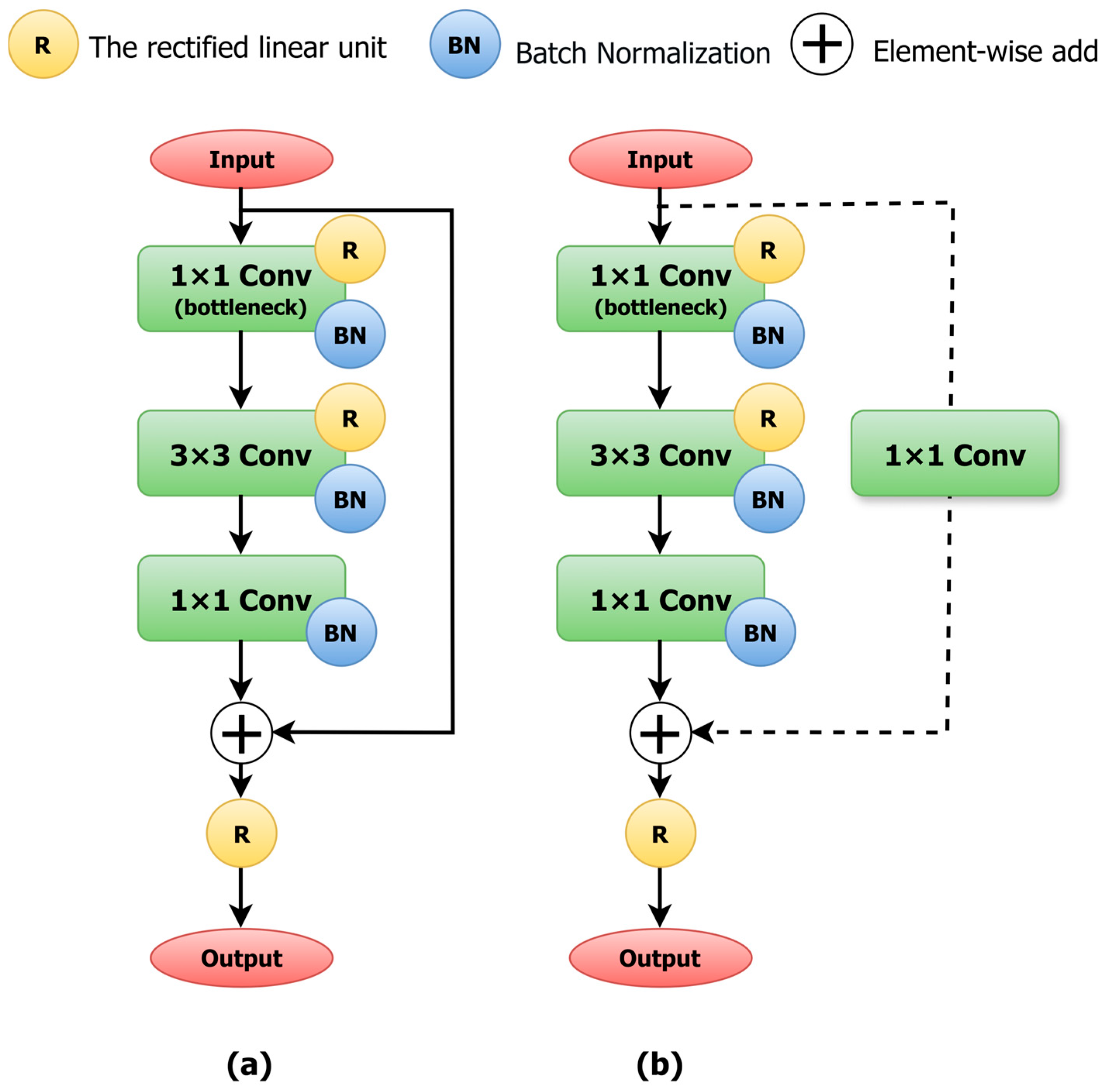 Figure 2. Bottleneck Residual Block: (a) Bottleneck Residual Block with . (b) Bottleneck Residual Block with .