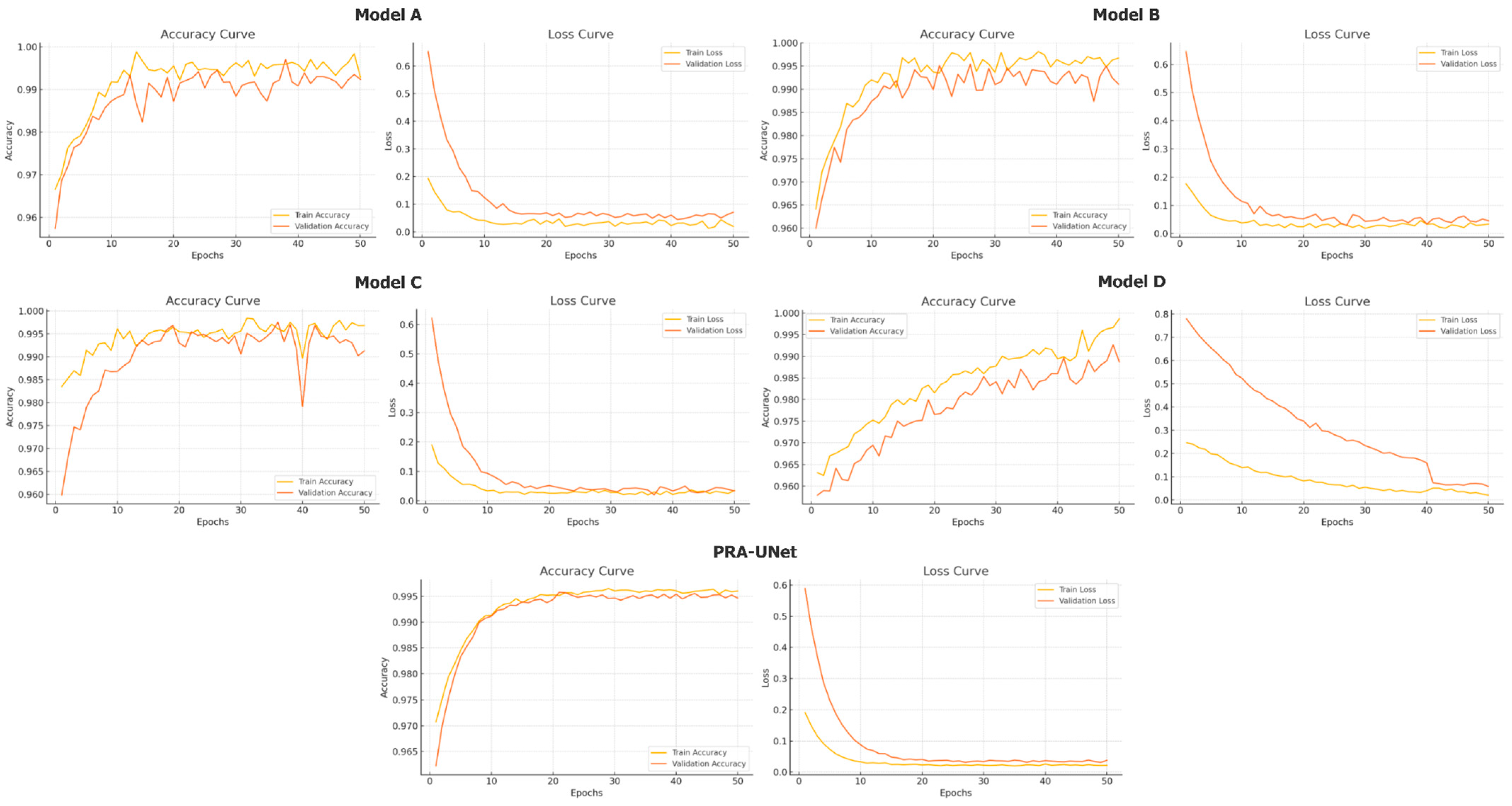 PRA-UNet’s architecture is designed to minimize computational complexity while maintaining high segmentation accuracy. This characteristic is particularly relevant for healthcare systems with constrained infrastructure [45], where many hospitals—especially in rural areas—lack advanced imaging hardware, computing resources, and specialized radiologists.