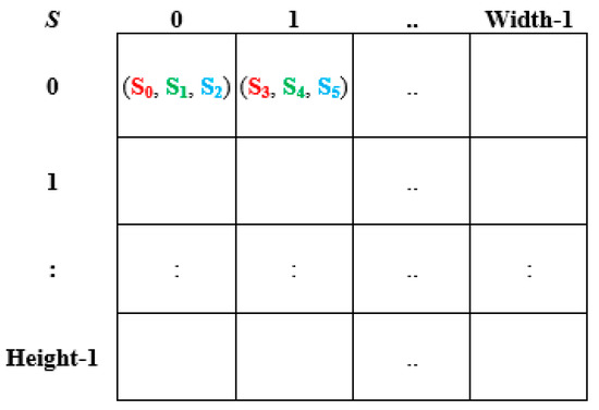 SES treats S as a string of bytes by reading the pixel values in S raw by raw. S = [(S0, S1, S2), (S3, S4, S5), …) as shown in Figure 1. The size of the image SSize is calculated using Equation (1).