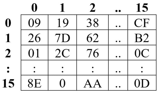• SBox: represents a two-dimensional block (16 × 16) containing non-repeating values between (0…FF)16 distributed randomly in the SBox. The seed value Seedv of the pseudo-random generation algorithm is used here to distribute the values in SBox. This means that the generated SBox will differ based on the initial key K. The pseudo-random generation of the SBox in SES ensures that substitution layers are dynamic, adding a layer of unpredictability compared to AES’s static S-Box. The process uses a secure random number generator to construct S-Boxes that satisfy cryptographic properties like high nonlinearity and differential uniformity. Figure 2 shows an example of an SBox, where the numbers in each cell are represented in the hexadecimal number system.