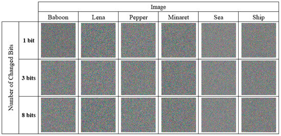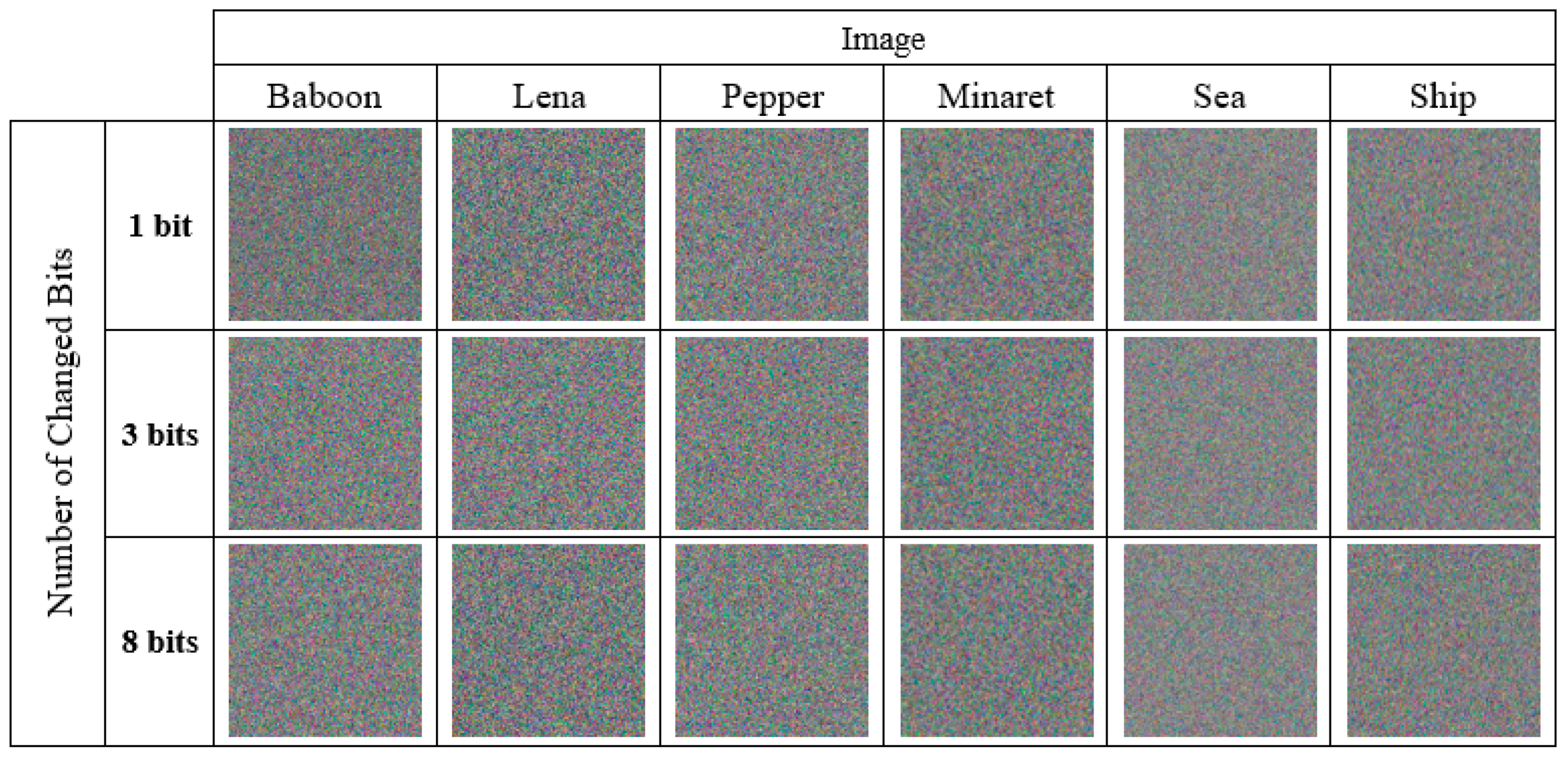 Figure 10. The recovered images after changing different numbers of bits in the encryption key for the images in Figure 8.