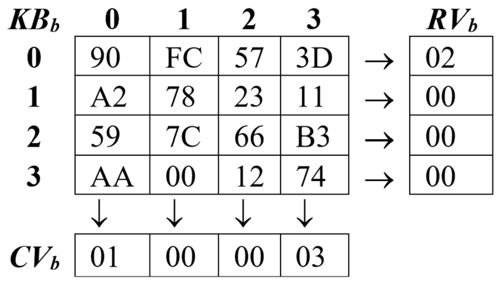 ColumnVector (CV): for each KBb, a CVb is generated that is a vector containing D elements, each CVb (j) element at index j (where j: 0 … D − 1) has a value that is calculated by performing an XORring operation between the values in column j in KBb using Equation (6). Figure 6 shows an example of a CV.