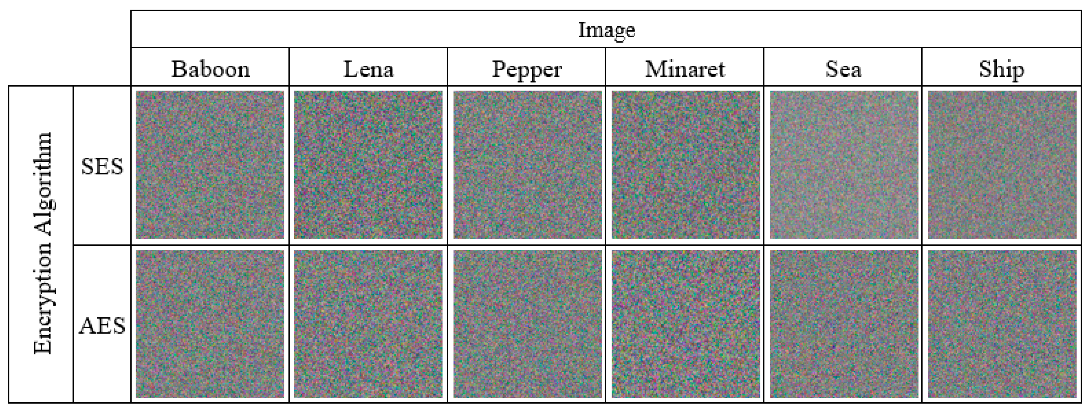 Figure 8. The encrypted images generated from the source images in Figure 7 using SES and AES algorithms.