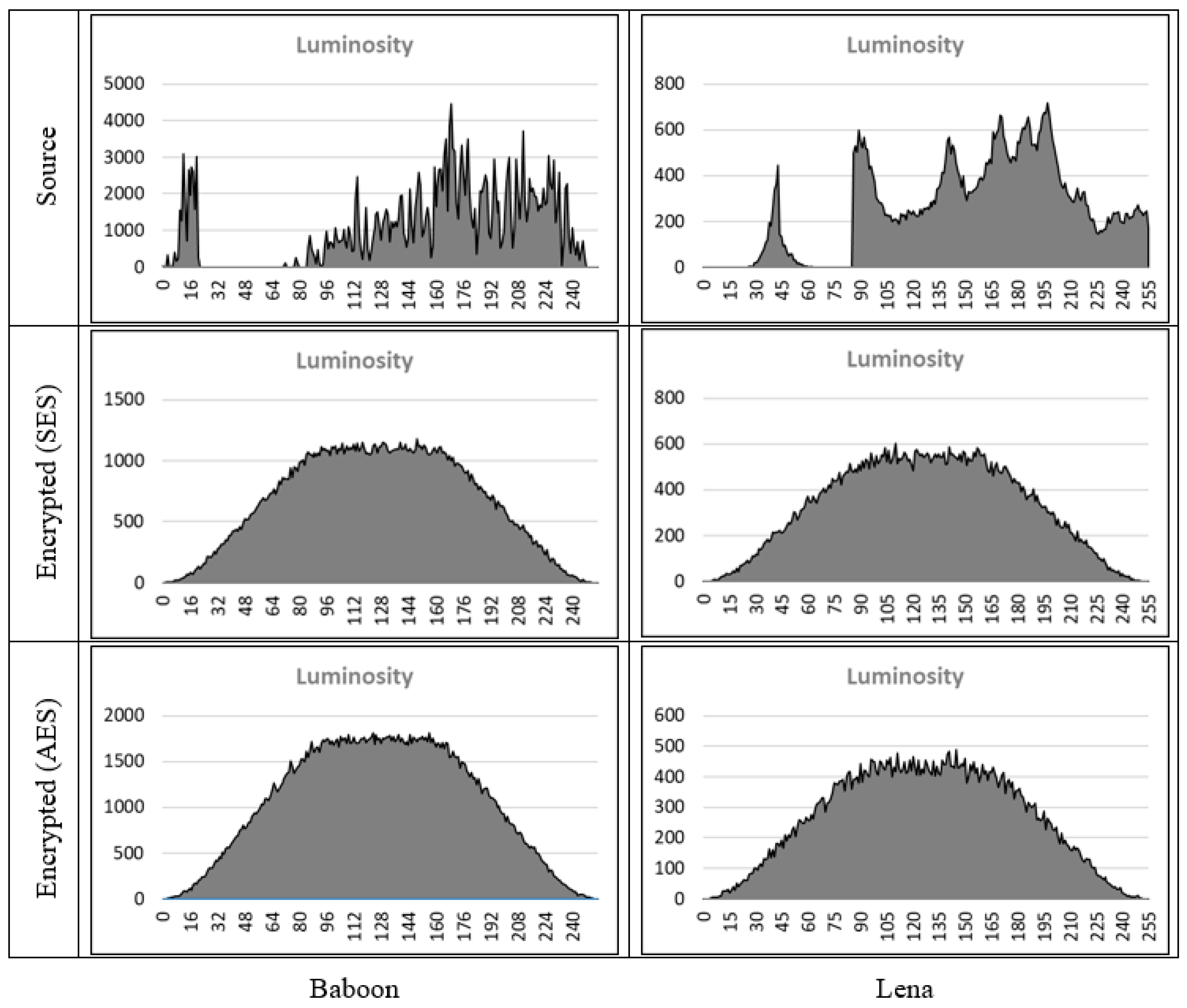 Figure 9. Histograms of the source and encrypted images generated using SES and AES algorithms.