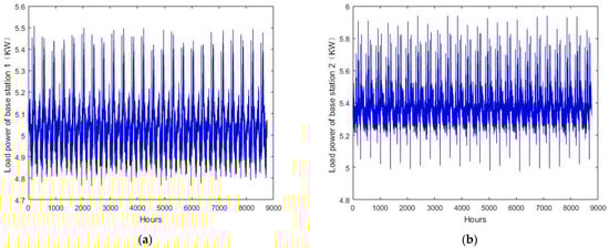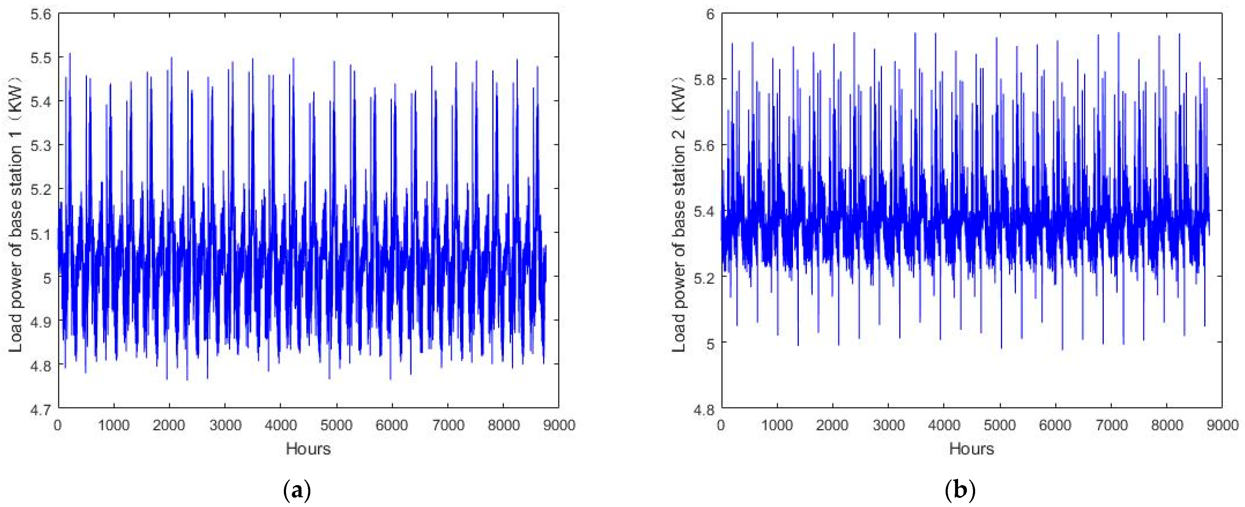 The load of communication base stations mainly includes direct current (DC) load and alternating current (AC) load. The AC load mainly includes air conditioning equipment and lighting equipment, while the DC load mainly includes base station wireless main equipment, transmission equipment, and other main equipment. The AC load power consumption of the communication load is relatively stable and will not be affected by the access and usage behavior of the base station users, which can be regarded as the static power consumption of the base station. The power consumption of the wireless master device of the base station will vary greatly with the changes in user access and usage behavior, also known as the dynamic power consumption of the base station [39].