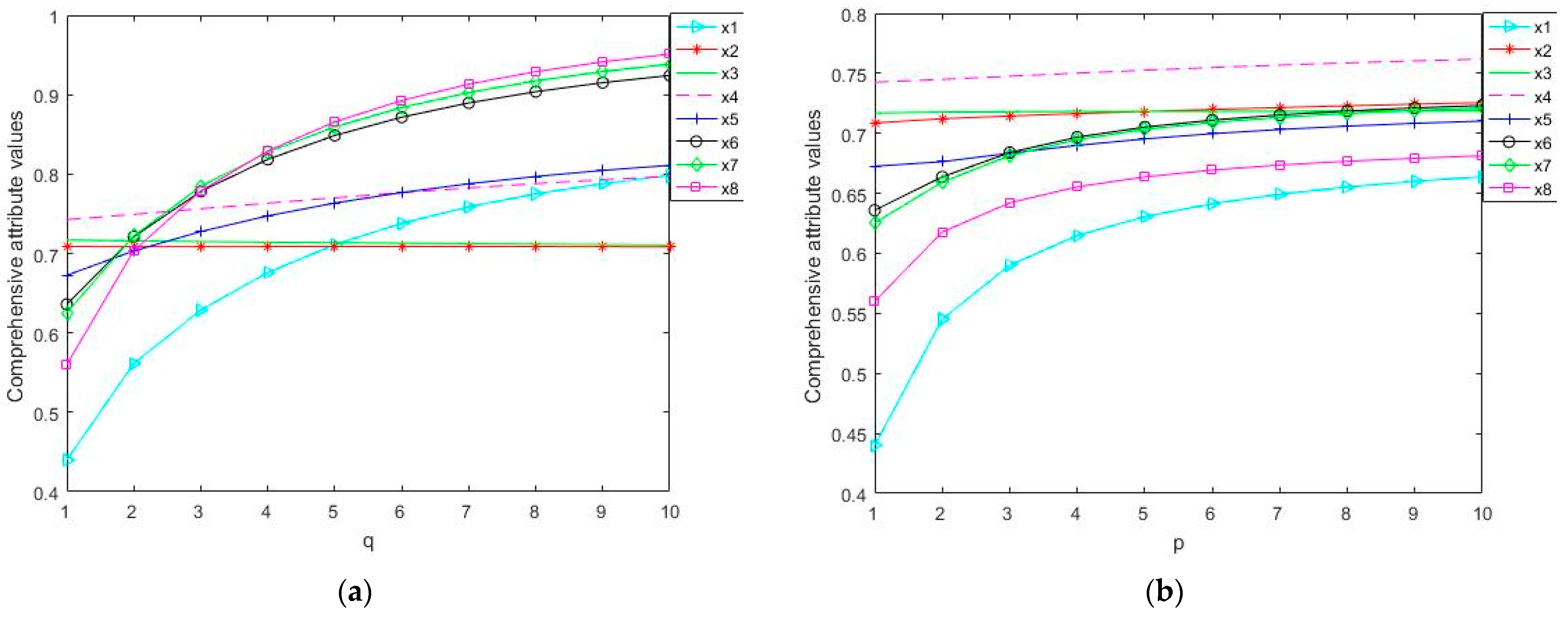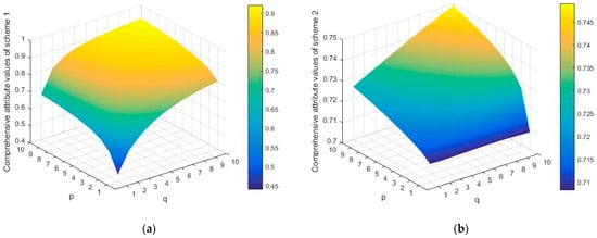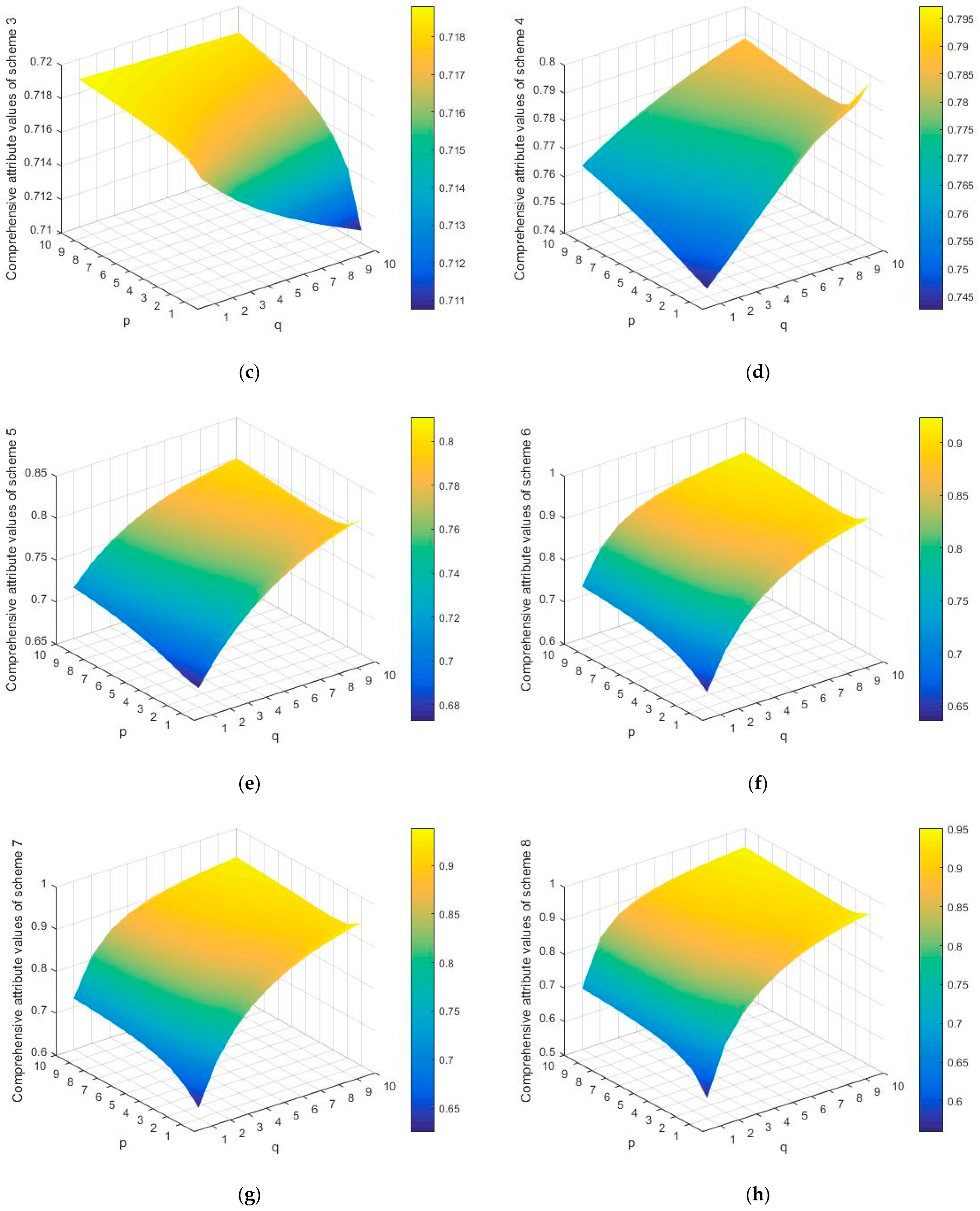 From Table 8, it can be seen that when the parameters p and q take different values, the ranking results of the schemes are not exactly the same, and the best scheme is