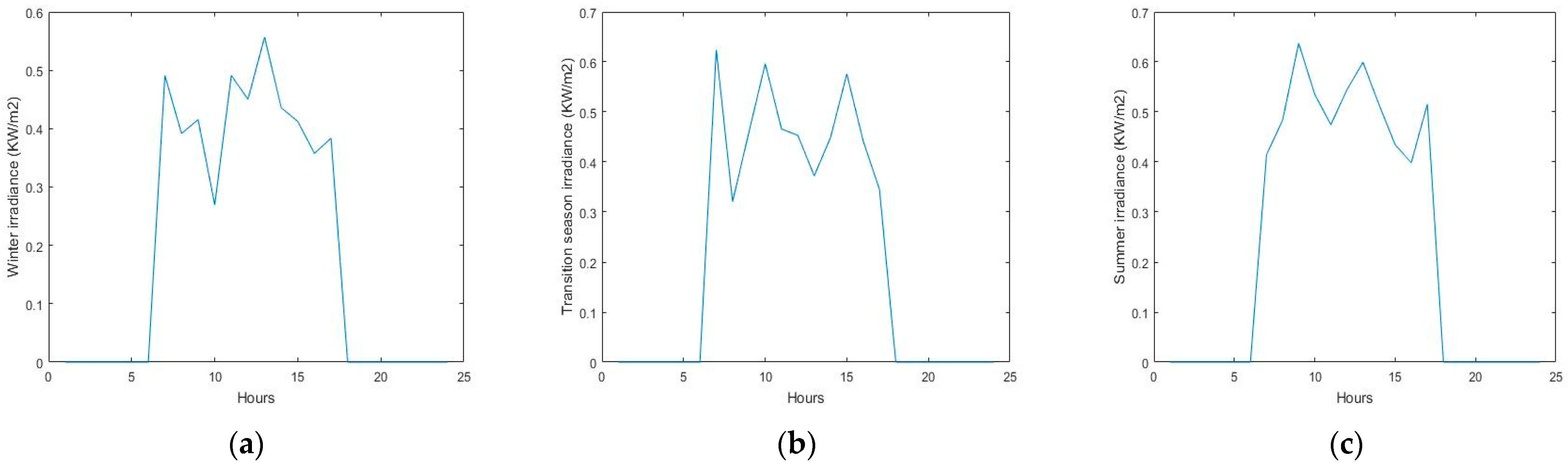 The output power of photovoltaic power generation is affected by different solar irradiance intensities and environmental temperature changes, and it can be expressed as [37]: