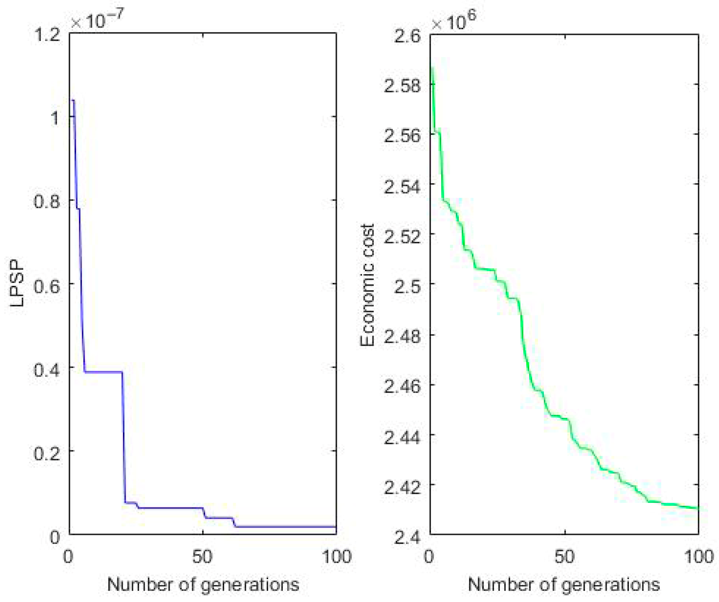 - Transforming multi-objective optimization problems into single objective optimization problems to solve. Li et al. [22] added up the economic cost, environmental conversion cost, and active network loss cost of microgrid as the optimization objective. Zhao et al. [23] established a multi-objective optimization model for independent microgrid capacity allocation and proposed a comprehensive analysis method of weight coefficients by combining fitness deviation sorting method and fuzzy analytic hierarchy process. This type of method requires a reasonable conversion of non-economic objectives into economic objectives. The rationality of the conversion directly affects the objective function and the optimization of capacity allocation results. Therefore, there is a high requirement for the rationality of the conversion and there is currently no unified conversion method [21].