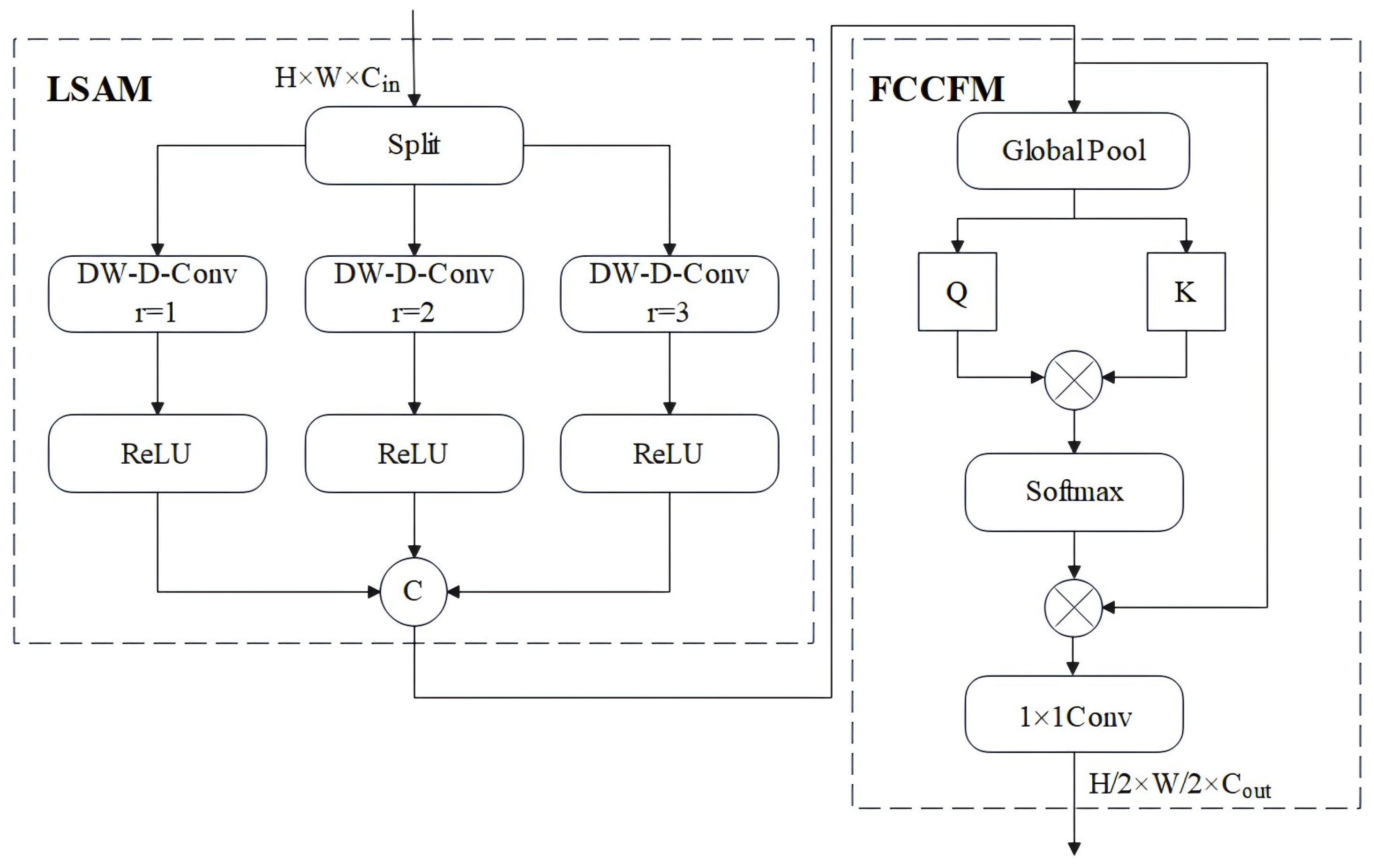 - This paper designs FCCFM, which constructs a correlation matrix between channels through a global descriptor and a self-attention mechanism, dynamically captures the correlation between channels, and realizes the fusion of full-channel spatial features.