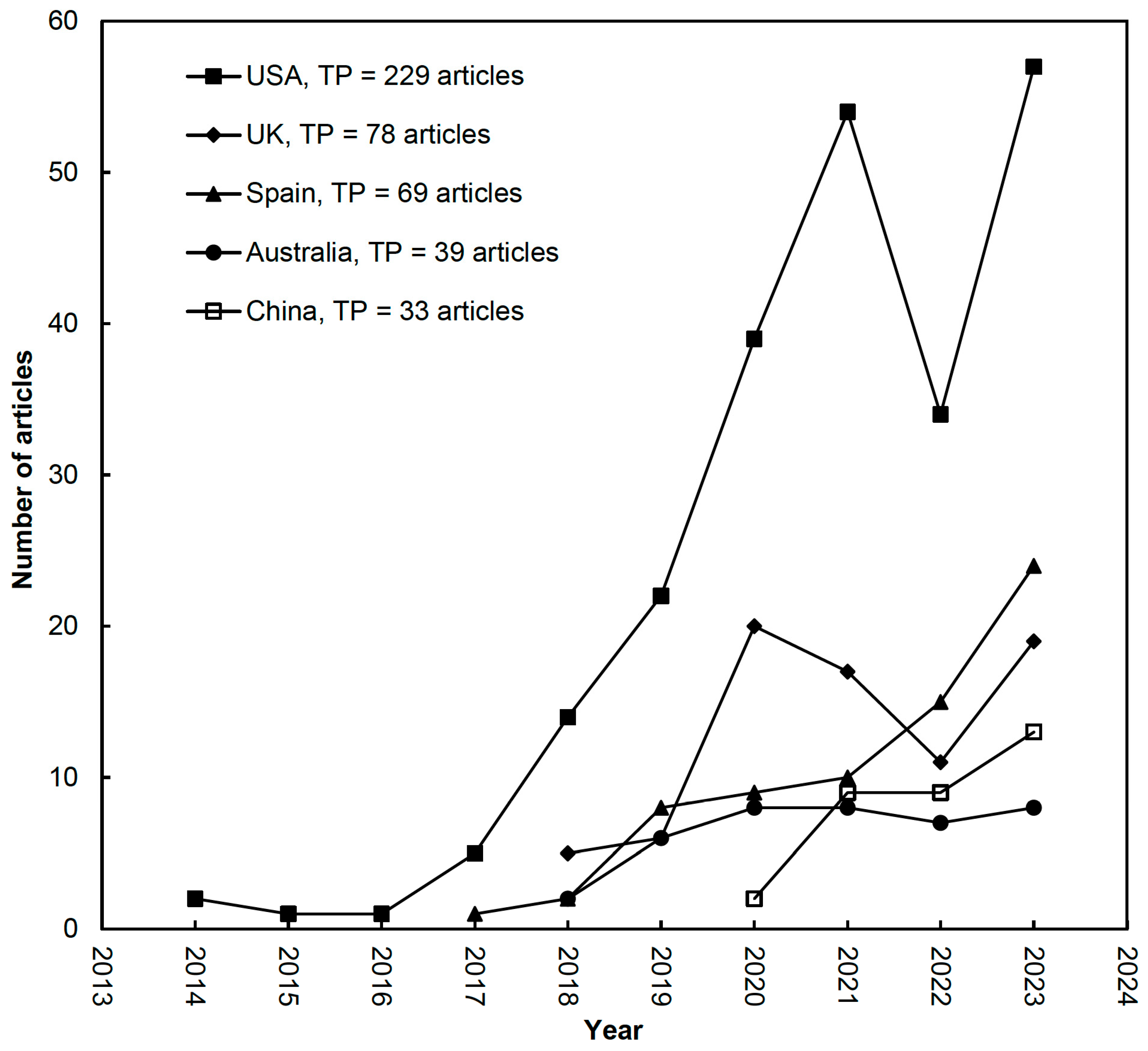 - Vargo, Guo, and Amazeen’s “The agenda-setting power of fake news: A big data analysis of the online media landscape from 2014 to 2016” (TC2023 = 271; C2023 = 46) ranked fifth in total citations [15]. Analyzing online media from 2014 to 2016, the study examined the rising impact of fake news during the U.S. presidential elections, emphasizing its societal and political effects. The effects of fake news on society and the consequences of these effects have garnered significant attention not only in academic circles but also in the media, politics, and the public.