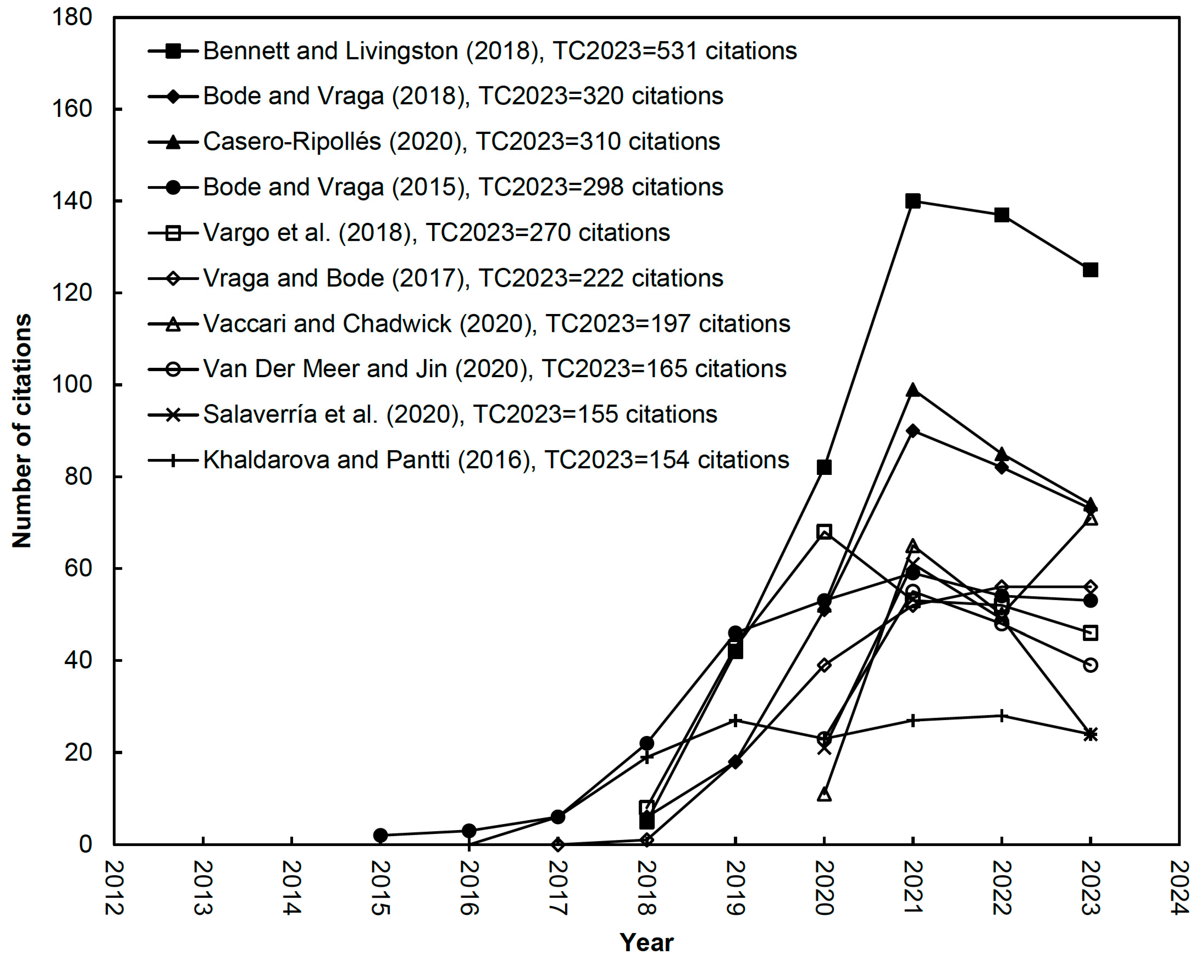 - Vraga and Bode’s “Using expert sources to correct health misinformation in social media” (TC2023 = 222; C2023 = 56) ranked sixth in total and fifth in annual citations [39]. This pre-pandemic experimental study highlighted the importance of expert sources in correcting health misinformation on digital platforms. Its relevance increased during the COVID-19 outbreak, emphasizing its significance in health communication literature.