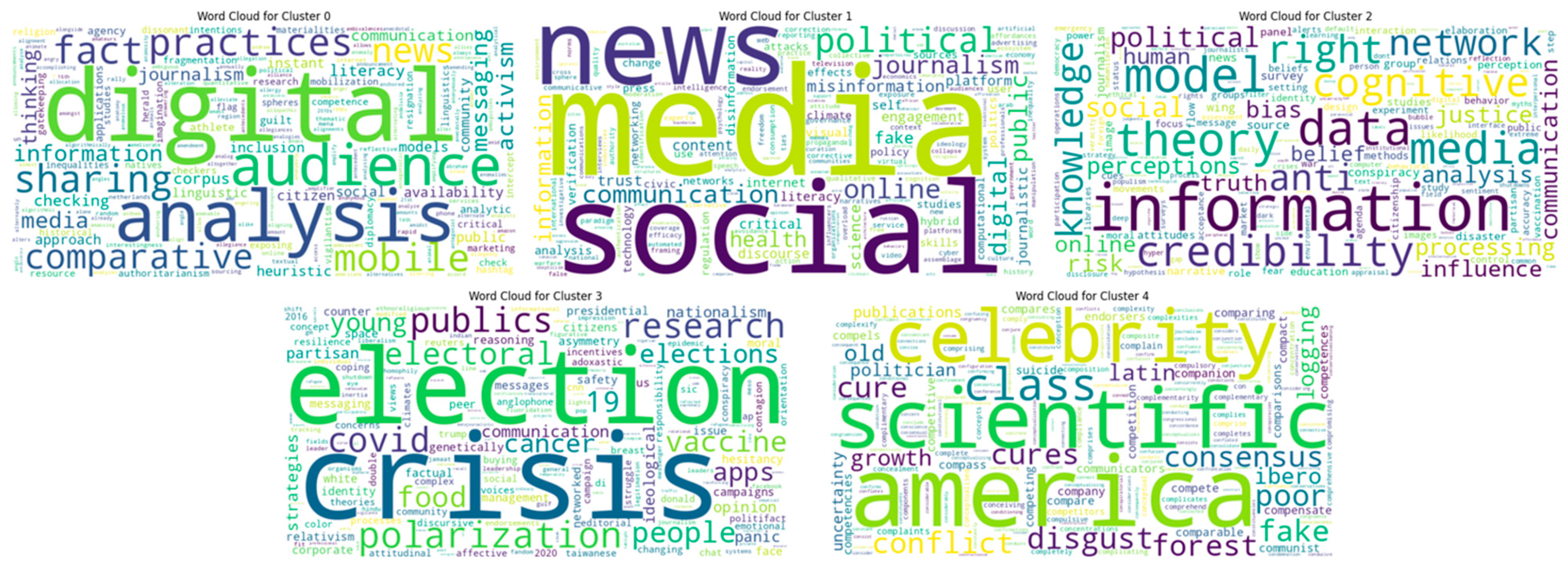 - Vijayan, V.; Thomas, T.; Nellanat, P.D. Mapping Fake News and Misinformation in Media: A Two-Decade Bibliometric Review of Emerging Trends. Insight-News Media 2025, 8, 734. [Google Scholar] [CrossRef]