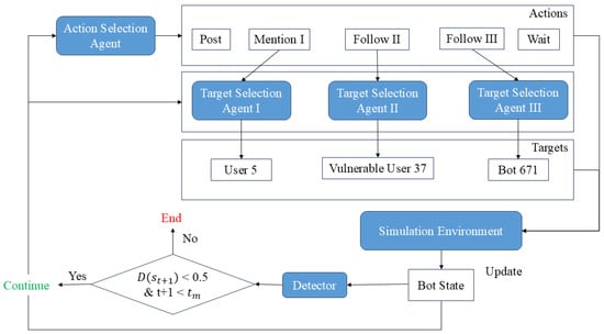 Reinforcement Learning (RL) is chosen as the core optimization paradigm for our framework due to its proven efficacy in navigating complex, sequential decision-making problems [43,44]. Its strength lies in an agent’s ability to learn optimal strategies through trial-and-error interactions with an environment, maximizing a long-term reward signal. This makes RL suitable for simulating the adaptive and strategic behaviors of social bots, which must continuously make decisions (e.g., whom to interact with, what to post) based on a dynamically changing social context. Furthermore, RL has been successfully applied in prior social bot research to optimize individual account strategies for evasion or influence [8]. The bot’s action is controlled by two agents responsible for action selection and target selection, respectively.