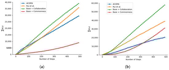 The results against the RF-based detector clearly demonstrate the superiority of the proposed mechanisms for influencer bots. The Base model, benefiting from its refined target selection strategy, achieved perfect 100% survival and generated over 8 million views, significantly outperforming both the ACORN baseline and the previous Rui et al. approach [36]. This advantage was further amplified by the Base + Collaboration model, which attained a 99.4% survival rate and achieved the highest overall influence with over 9 million views, proving that coordinated activity enhances a bot network’s reach and resilience. The temporal dynamics of follower accumulation, as shown in Figure 6a, also provide evidence: the follower growth curve for Base + Collaboration consistently resides above all other methods throughout the simulation duration. In contrast, the Base + Commonness strategy—which encourages mimicry of relatively high-activity human behavior—proved counterproductive for influence campaigns. It limited the bot’s reach to just 316 thousand views, as its objective conflicts directly with the goal of maximizing visibility. The Full model only partially mitigated this conflict, confirming that advanced targeting and cooperation are the primary drivers of performance for influencer bots. It is also notable that no other controlled bots were detected during these simulations.