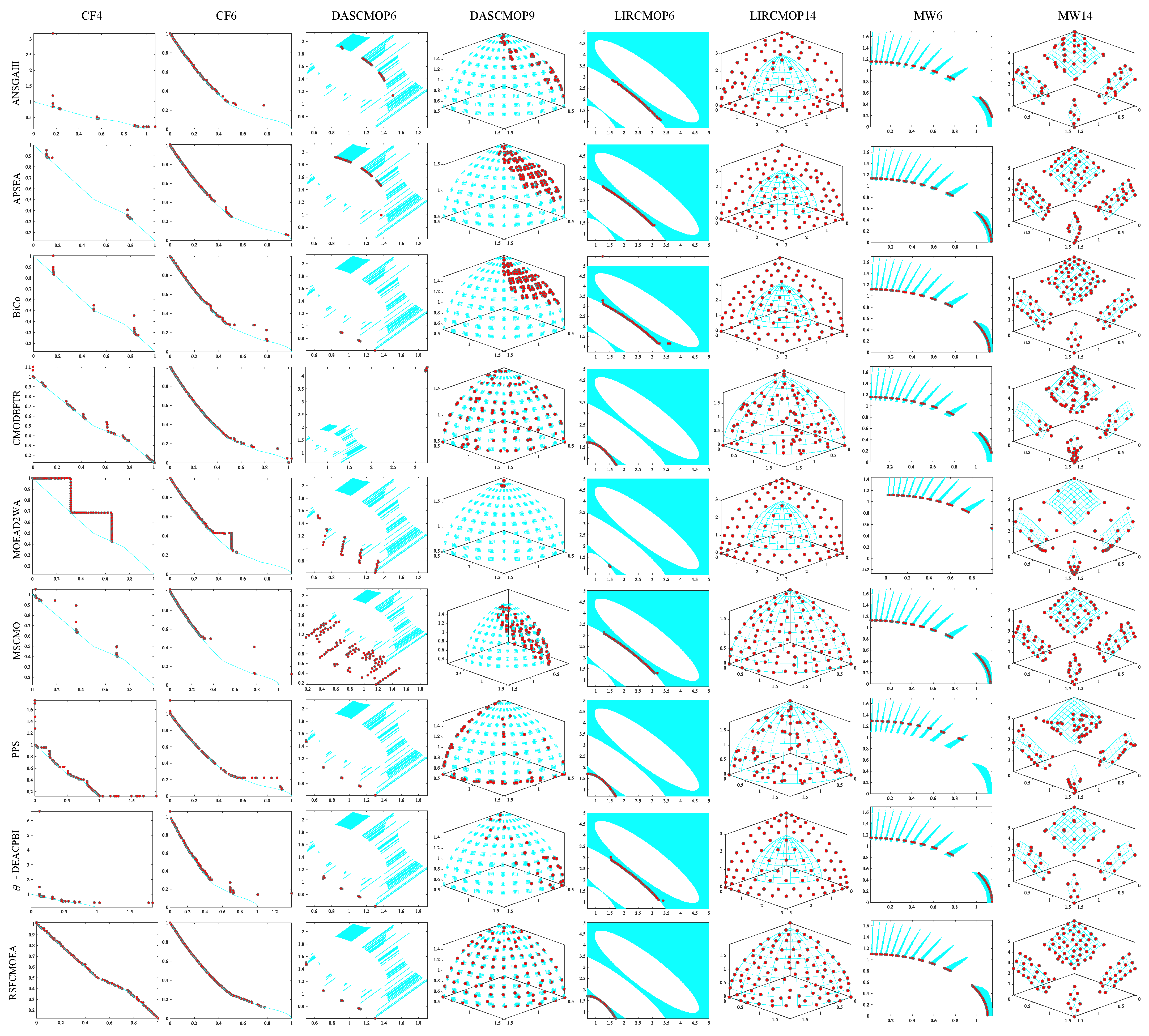 - Fan, Z.; Li, W.; Cai, X.; Li, H.; Wei, C.; Zhang, Q.; Deb, K.; Goodman, E. Difficulty Adjustable and Scalable Constrained Multiobjective Test Problem Toolkit. Evol. Comput. 2020, 28, 339–378. [Google Scholar] [CrossRef] [PubMed]