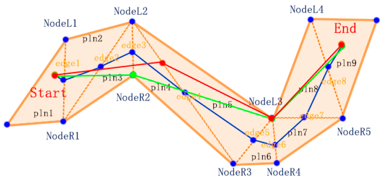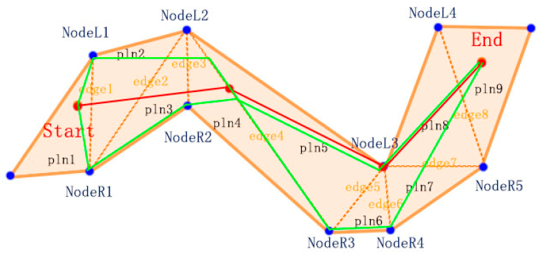 | For a given convex polygon, there are: The starting point is: Start, and the end point is: End. FindNextTracePoint(TracePoints,Edges,End) Input:TracePoints,Edges,End Output:Path Select First P ⊂ TracePoints Make Line L_Start_To_End Find Nearest edgei If(L_Start_To_End intersect with edgei) { Calculate the intersection: cross_point_i; | For each point in {leftPointi, cross_point_i, rightPointi} End } Else { For each point in {leftPointi, rightPointi} End } If TracePoints !=Null Return Step:FindNextTracePoint Else Return Final Path End |