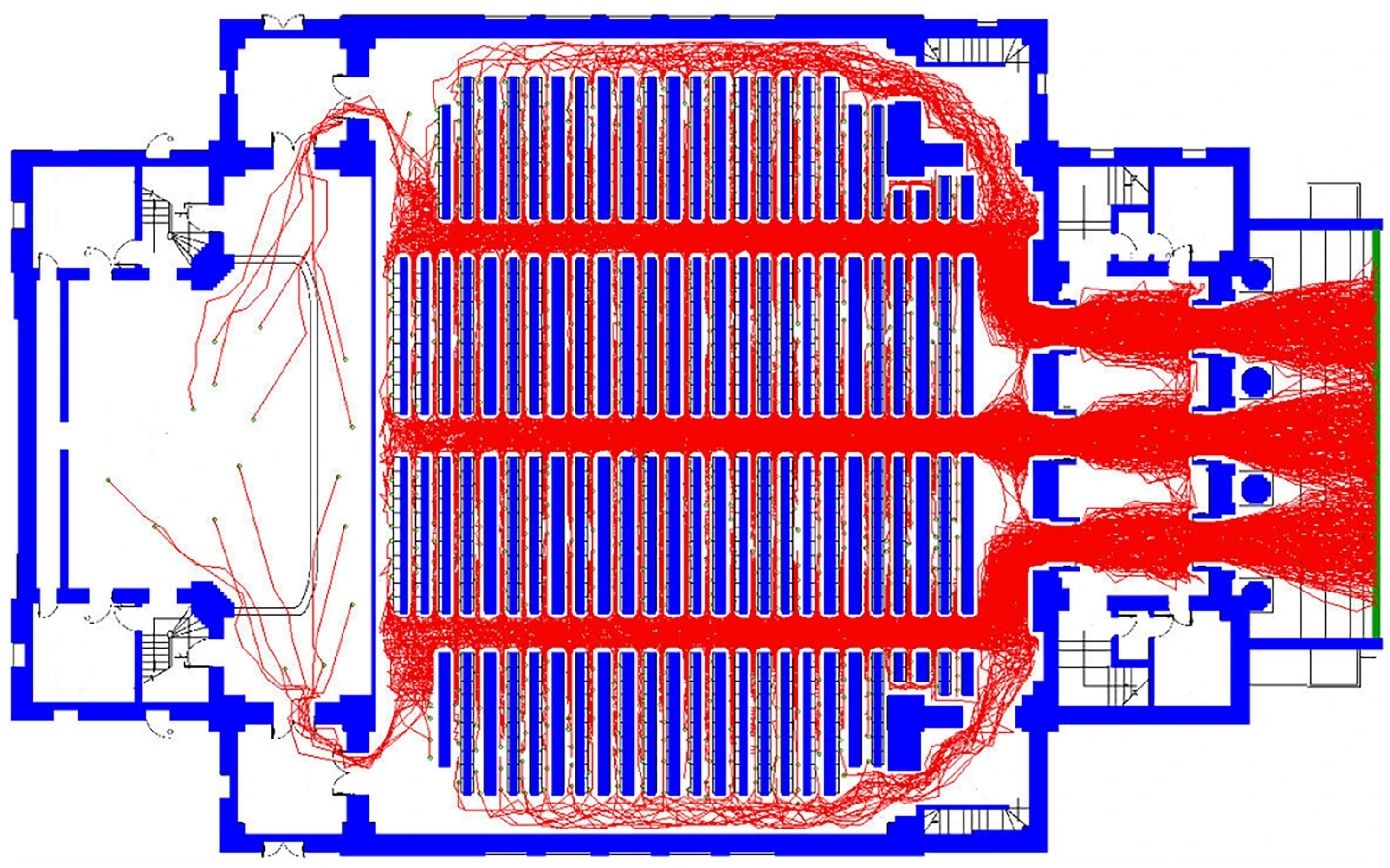 | APFM [31] | 100 | 500 | [20,40] | The evacuation time is positively correlated with the number and width of exits (non-linear), and the steep slope inflection points exist at both ends of the evacuation relation curve. | |