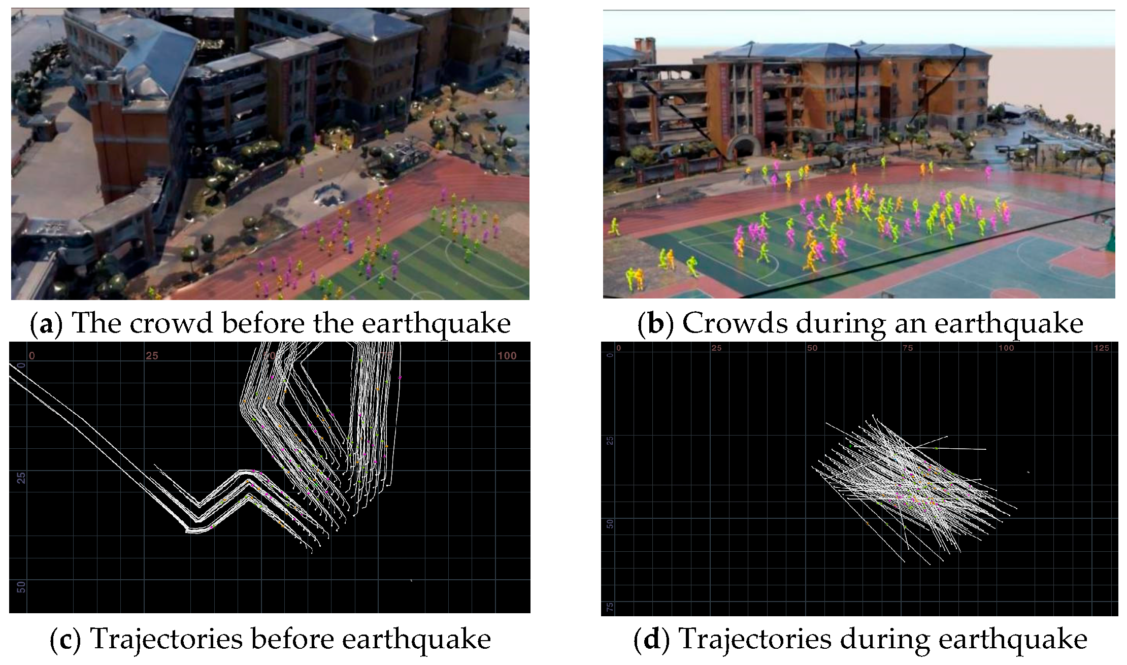 - Zou, X.; Ye, Y.; Zhu, Z.; Chen, Q. Crowd evacuation simulation in flowing fluids. Comput. Animat. Virtual Worlds 2023, 34, e2161. [Google Scholar] [CrossRef]