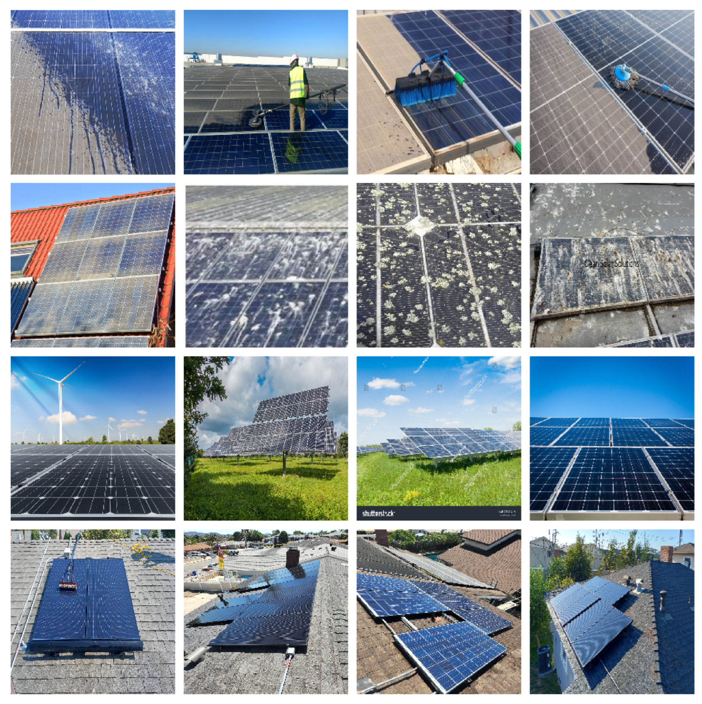 - We do not employ any additional sensing modalities such as infrared or electrostatic/deposition sensors—nor do we attempt to measure or estimate physical dust layer thickness μm, mass density (mg/cm2), or other quantitative deposition metrics. Our proposed classification pipeline is based on RGB images where the labels are assigned purely by visual criteria.