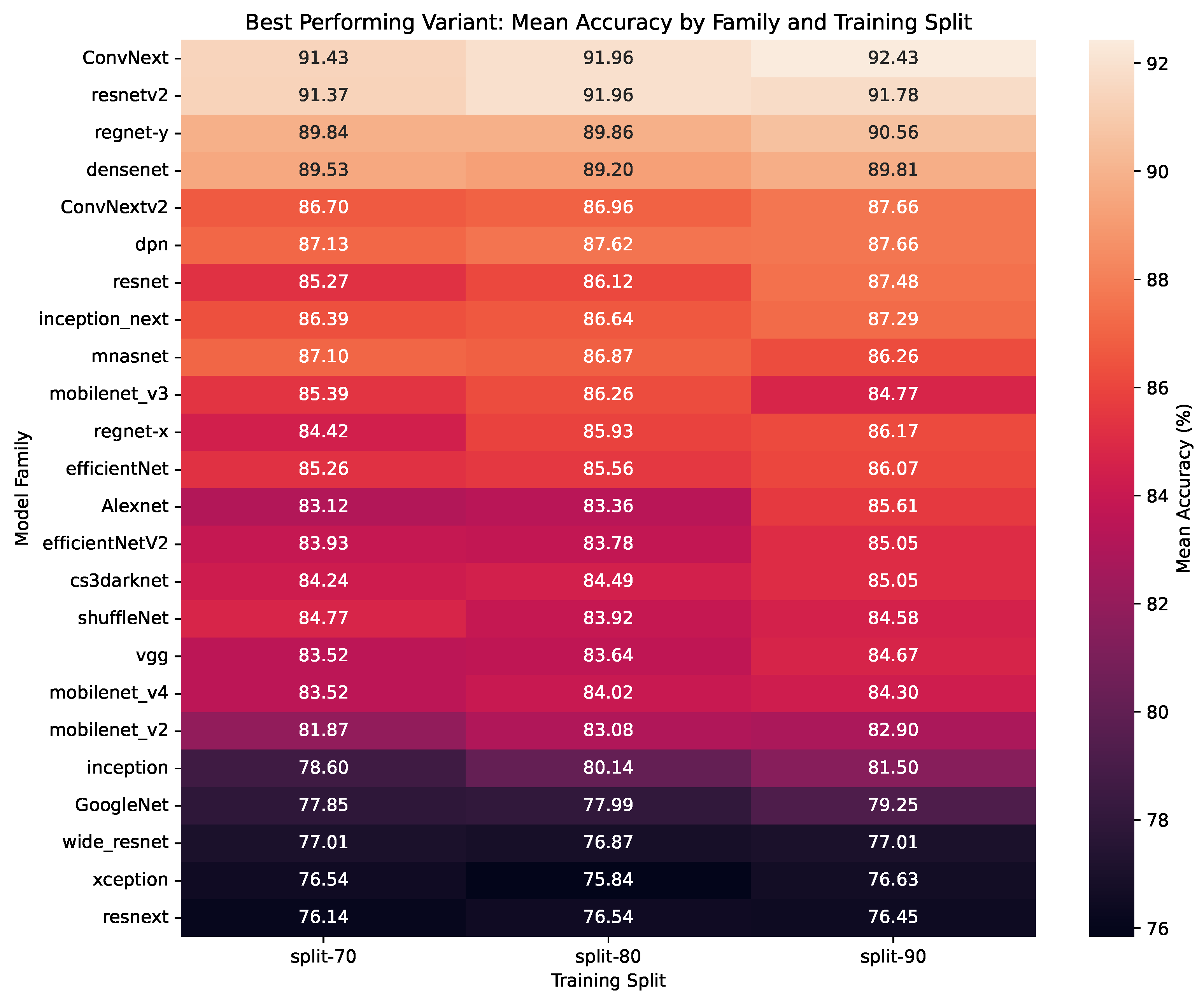 - Performance across all the three splits: To show the collective performance of both the best-performing models across all three splits, we performed the experiments with each of the three splits. We show the collective behavior of both CNN models in Figure 8a. The results highlight the stability and effectiveness of both models, with convnext_xxlarge displaying a slightly higher median and lower variance.