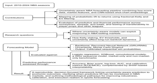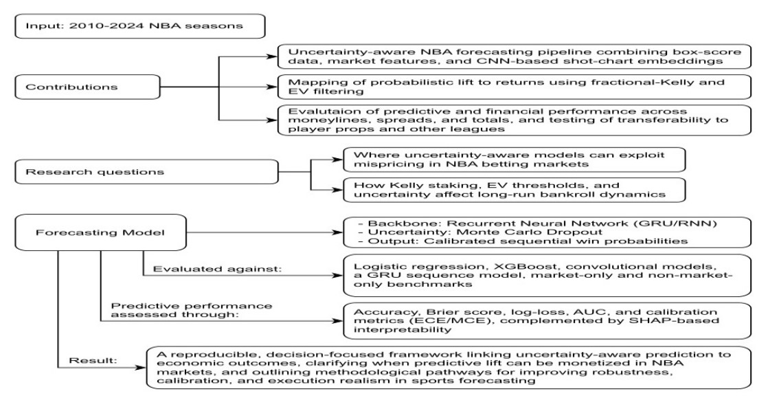 Despite substantial progress, no prior work jointly integrates (i) high-resolution pre-game spatial embeddings derived from shot chart heatmaps, (ii) recurrent neural architectures with Monte Carlo dropout for calibrated uncertainty over sequential form indicators, and (iii) an explicit, market-aware decision layer based on expected-value thresholds and fractional-Kelly staking evaluated under strict chronological splits.