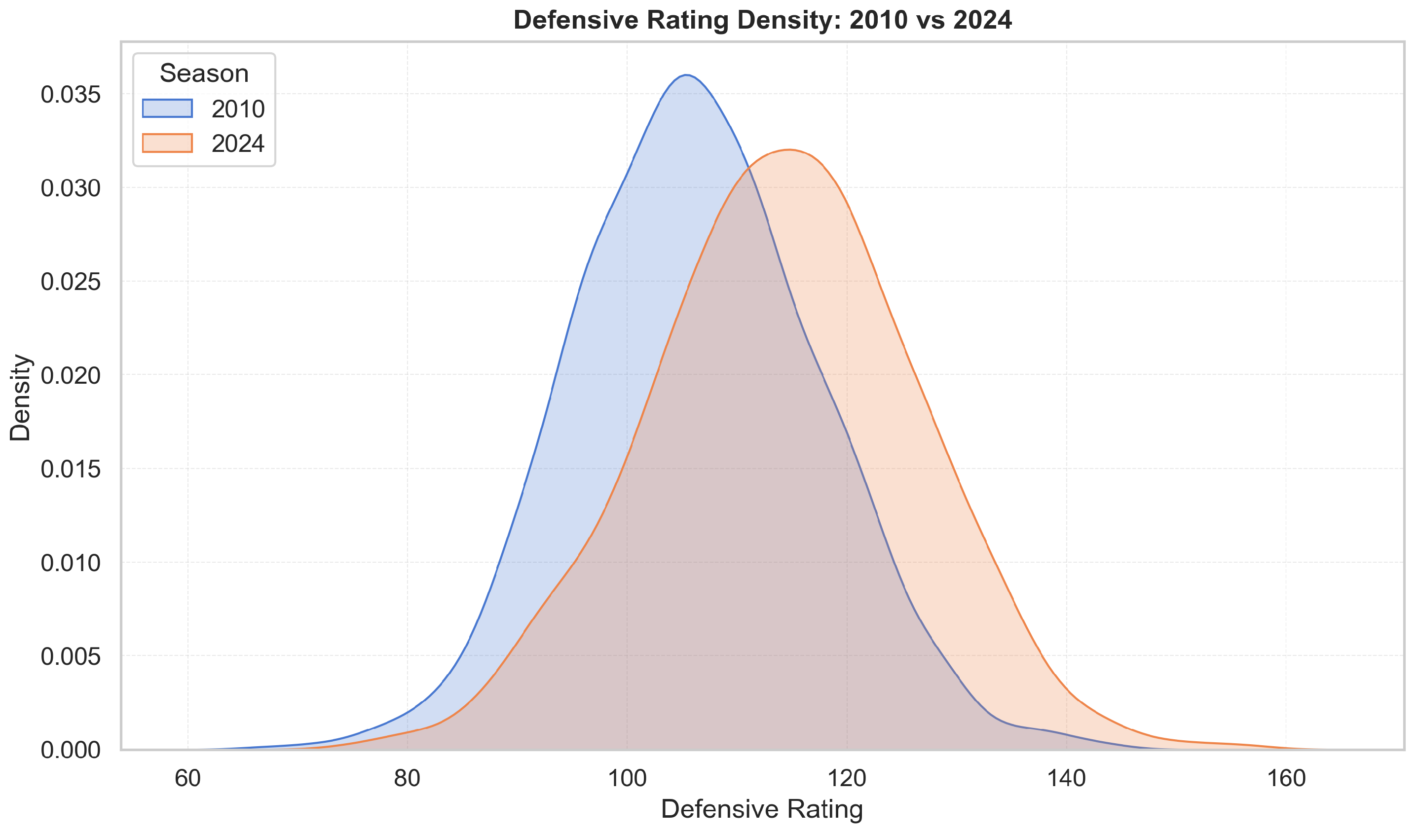 Figure 3). The rightward shift of the offensive rating density in 2024 relative to 2010 (