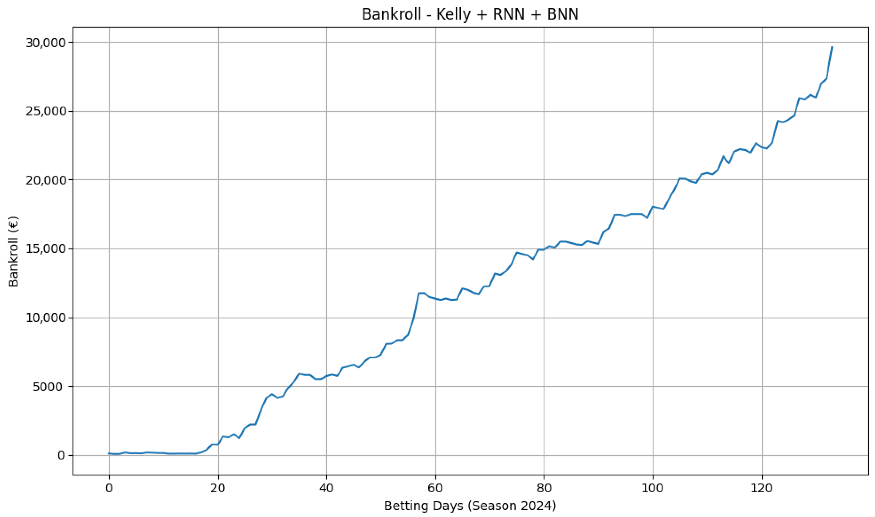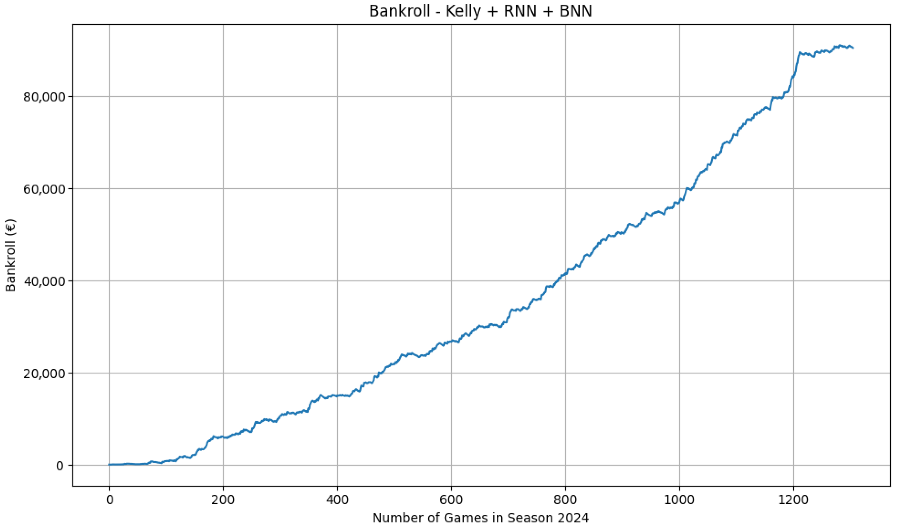 Figure 6 reports the bankroll trajectory obtained using our main model, which grows substantially over time (final bankroll