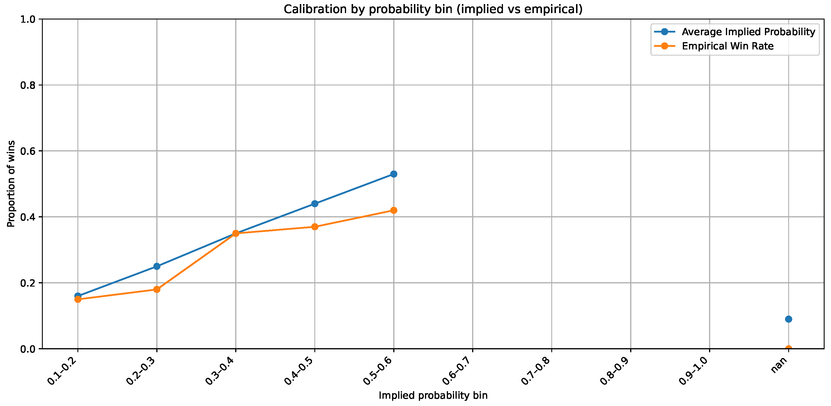 Figure 13 compares market-implied and empirical calibration. The calibration curves display a systematic gap, with favourites tending to be overpriced (empirical win rates below implied) and underdogs underpriced. This structural miscalibration motivates a decision layer driven by calibrated model probabilities: When the model’s estimates exceed market-implied levels by a margin that survives the EV and Kelly filters, the pipeline identifies genuine value rather than amplifying noise. Taken together,