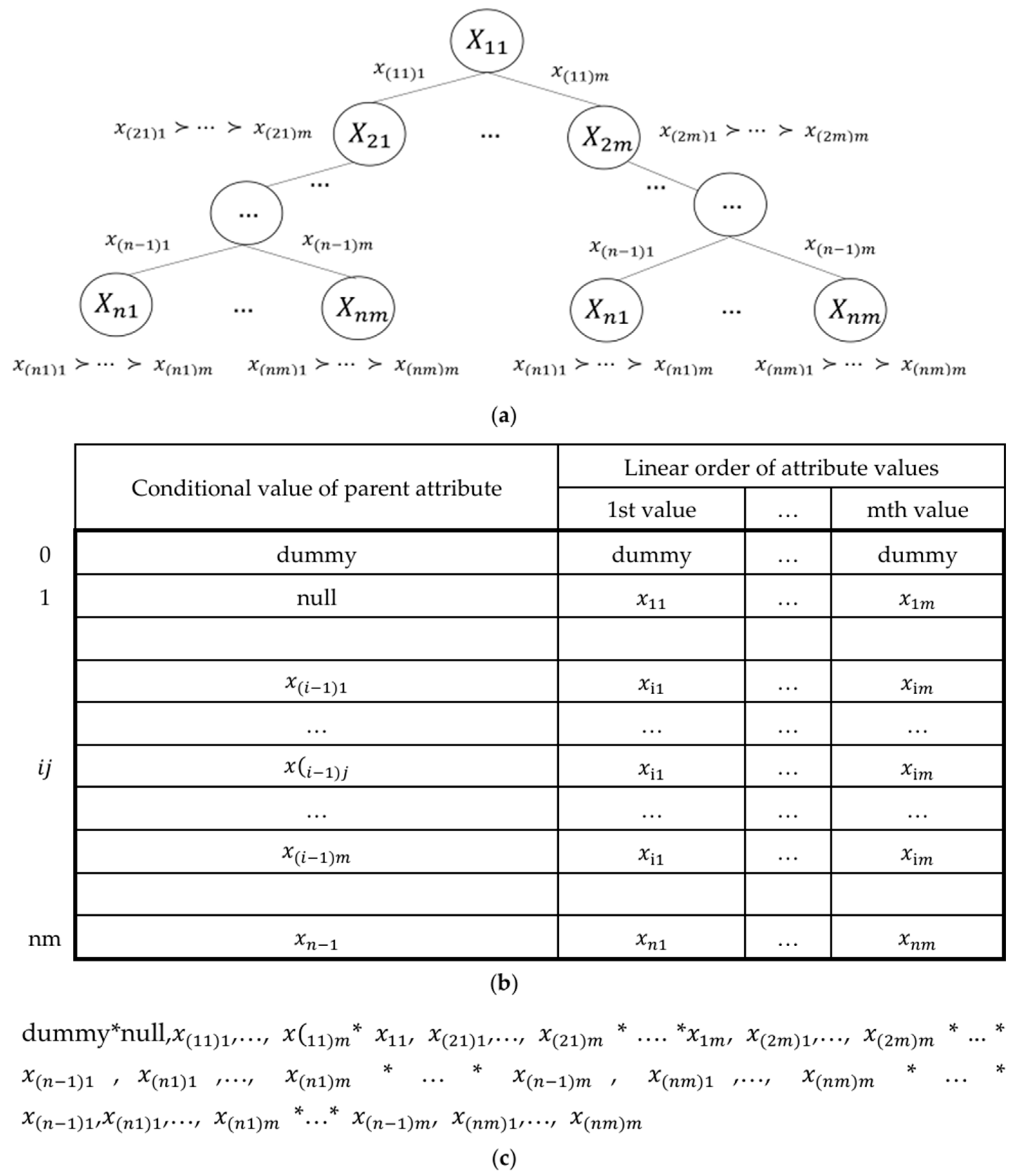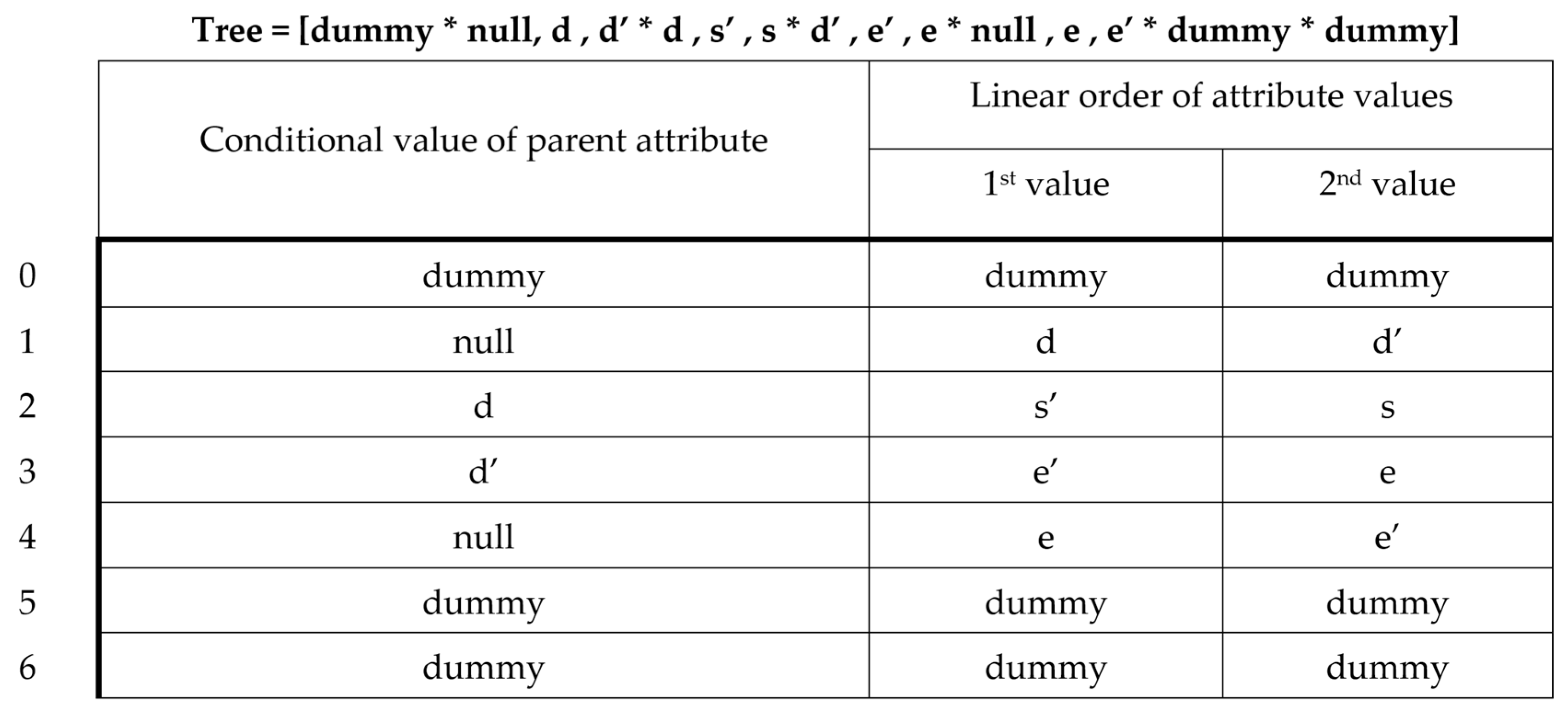 - Now, each row of the array itself contains three parts, such that the parent node’s conditional value is located in the first cell. The second and third cells correspond to the priority of the values of each attribute. The second cell is the value that is preferred over the third one. More precisely: