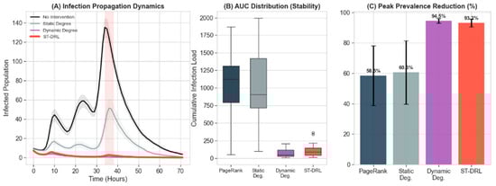 Figure 2A visualizes the temporal evolution of infection under different interventions. The “No Intervention” trajectory (black curve) reveals the inherent volatility of the ecosystem, characterized by a catastrophic surge during the event window where infection counts peak at about 140. The “Static Degree” baseline (gray curve), restricted by its reliance on time-invariant topology, fails to adapt to the sudden activity shift, resulting in a delayed and insufficient response. In sharp contrast, ST-DRL (red curve) effectively “flattens the curve”, maintaining the infection count near zero throughout the entire simulation horizon. Its trajectory closely mirrors that of the Oracle baseline, demonstrating that the agent has successfully learned to approximate the optimal reactive upper bound through end-to-end training.