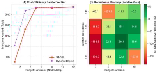 Economic efficiency and robustness landscape under varying constraints. (A) Pareto Frontier of infections averted versus budget. ST-DRL (red) demonstrates superior marginal utility, particularly in critical low-budget regimes. (B) Robustness heatmap displaying the relative performance gain over the strong greedy baseline. Positive gains (green zones) are maximized in high-complexity scenarios, confirming the value of long-term planning under stress.