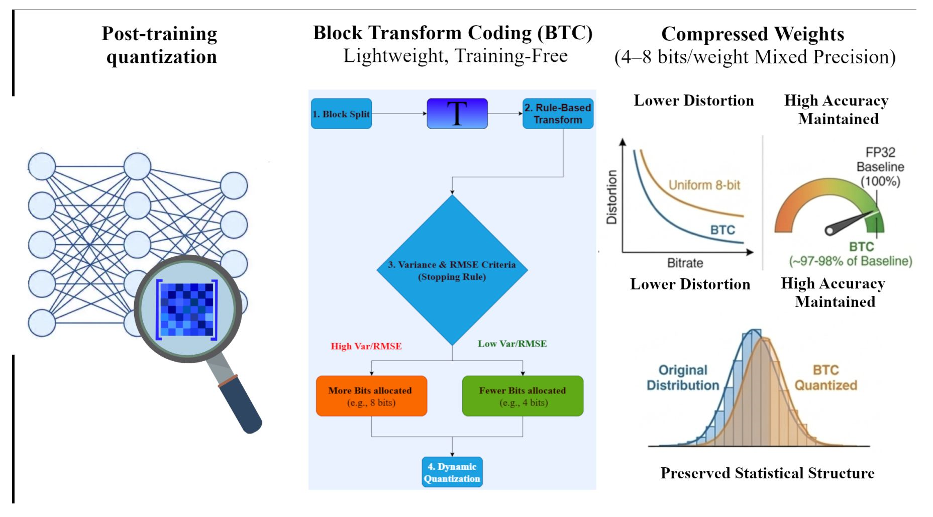 Figure 1) reveals why BTC maintains low distortion: the transform-domain representation mitigates quantization granularity and preserves inter-weight correlations.