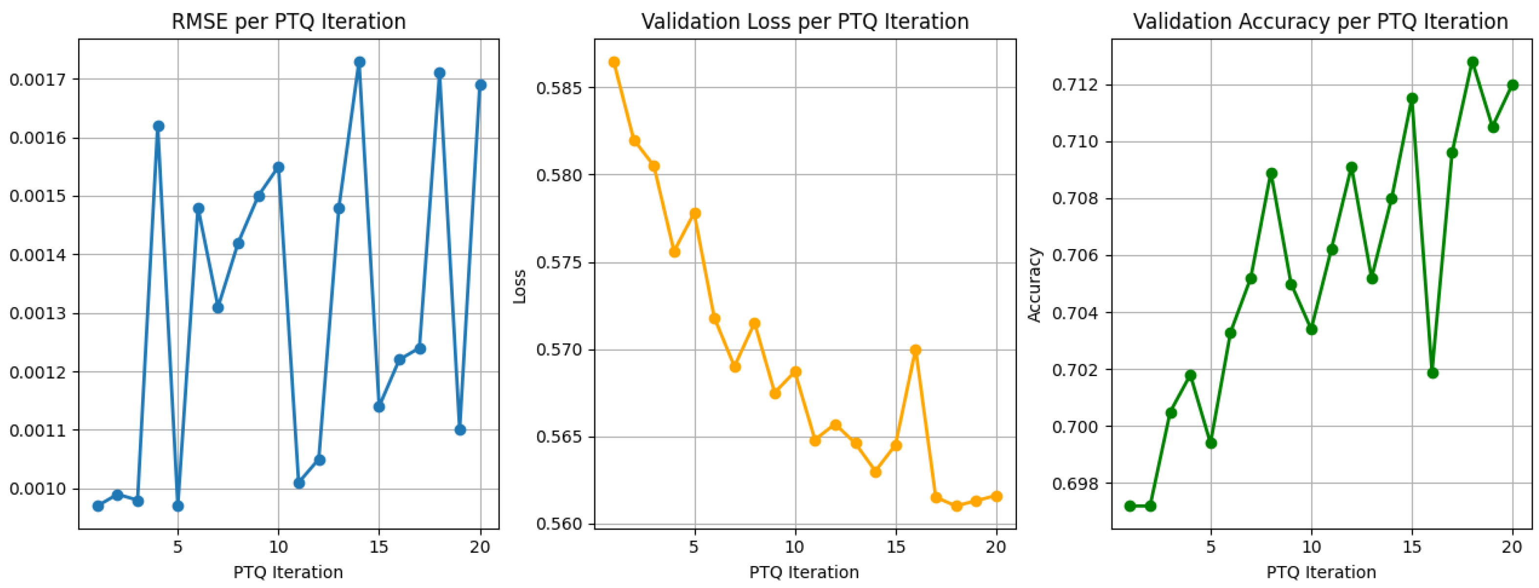 Figure 3 reports the post-training evaluation loss and accuracy obtained after each PTQ iteration for the MLP architecture. The results demonstrate that BTC preserves inference stability under post-training weight quantization, yielding smooth post-training loss behavior and stable accuracy across successive quantization configurations without retraining, backpropagation, or weight updates.