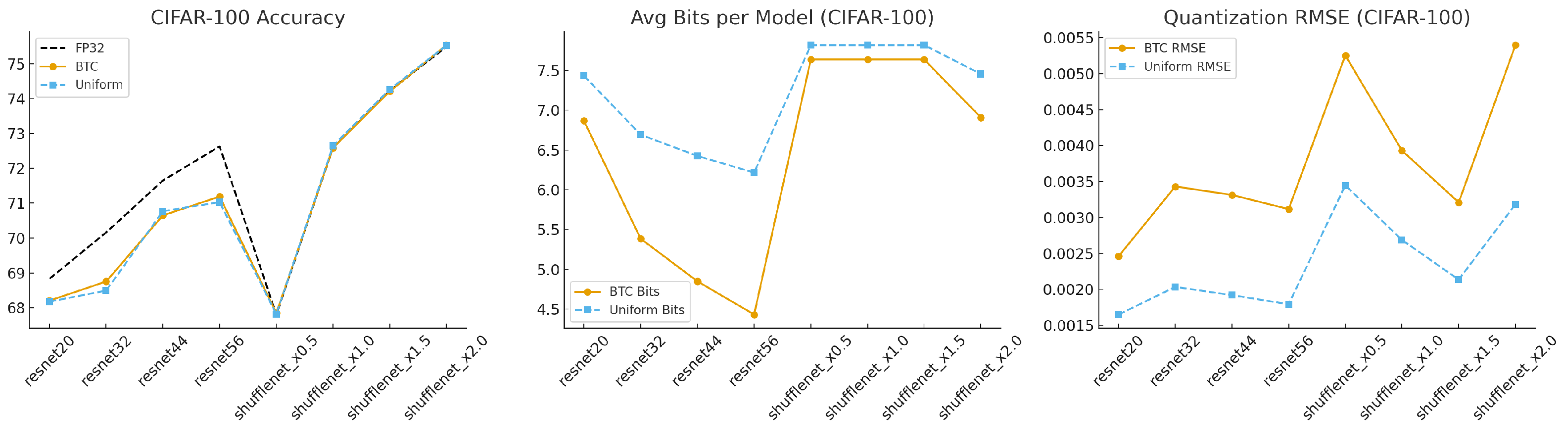 Table 2 show that BTC consistently preserves accuracy across all evaluated architectures while achieving substantial bit-rate reductions. For the four ResNet variants, BTC remains within 0.4–0.6 pp of the FP32 baseline, while reducing average bit usage from a fixed 8 bits (uniform) to just 4.1–5.0 bits, representing a 35–50% compression gain. Importantly, BTC achieves even lower RMSE values than uniform quantization in most cases, confirming that the block-transform re-encoding preserves the underlying weight structure more faithfully. ShuffleNetV2 and MobileNetV2 models follow the same trend: accuracy differences between BTC and FP32 are negligible (≤0.6 pp), with BTC achieving competitive RMSE values and consistently better compression than uniform quantization. The CIFAR-100 benchmark in