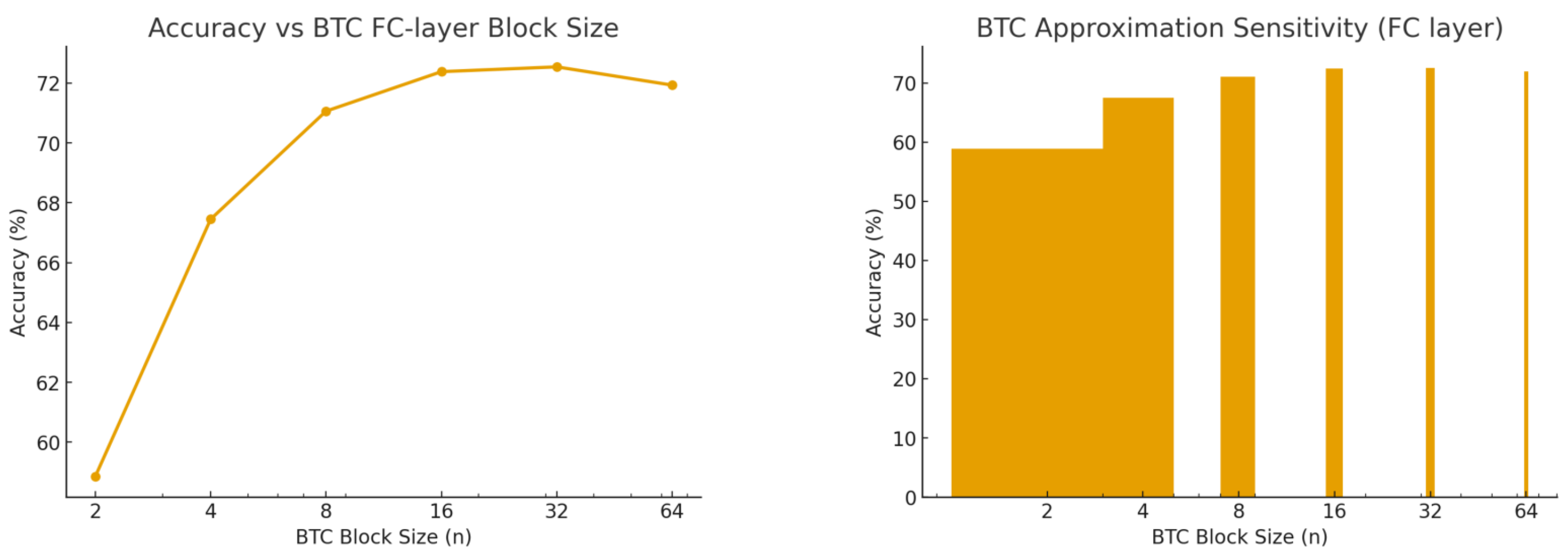 Figure 6 analyzes BTC behavior as the block size increases (2, 4, 8, 16, 32, 64). Accuracy saturates rapidly for block sizes