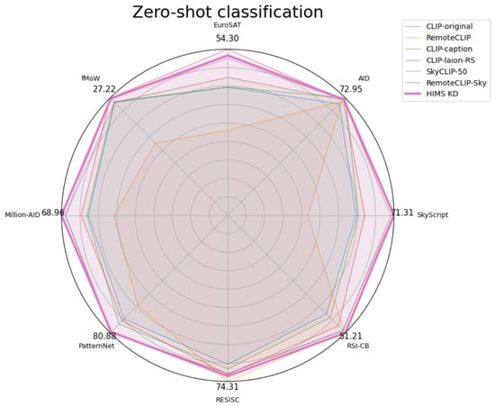 We base our knowledge distillation experiments on RemoteCLIP [21]. For zero-shot classification, we use RemoteCLIP/ViT-L/14 as the teacher model. The assistant models are implemented by partitioning the teacher backbone into three hierarchical segments and distilling each segment into an assistant. In HIMS_KD2, the final student backbone is ViT-L/14 (i.e., the same backbone size as the teacher); this setting is included to isolate the benefit of hierarchical teacher–assistant training on accuracy and generalization under an unchanged model size (it is not a compression setting). In contrast, HIMS_KD1 replaces the teacher with the original CLIP/ViT-L/14 while keeping the same hierarchical training pipeline. The performance comparison of HIMS_KD1 and HIMS_KD2 is shown in Table 1.