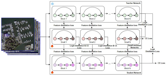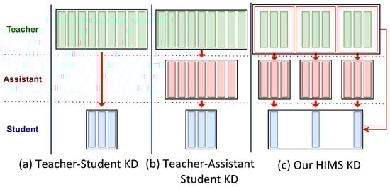 Several works introduce intermediate assistant models to help students learn more effectively from teachers, especially when there is a large capacity gap between the student and the teacher [6,25]. Mirazadeh et al. [6] proposed teacher–assistant knowledge distillation (TAKD), which sequentially trains multiple assistant models between the teacher and the student. The SleepKD [26] further introduced multiple distillation modules for teacher–assistant and assistant–student alignment, including epoch features, sequence features, logits and labels. However, errors can accumulate in sequential assistant distillation pipelines. To mitigate this issue, densely guided knowledge distillation (DGKD) [25] distills knowledge from the teacher and multiple assistants directly to the target network to reduce erroneous knowledge transfer.