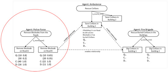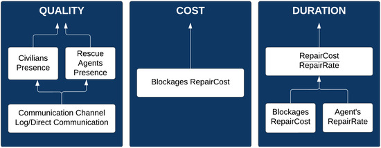 Figure 4 illustrates the QCD instantiation process. A baseline quality is assigned to each blockade; this value is multiplied by 3 for blockades near trapped civilians and by 2 for blockades near trapped rescue agents. Duration is computed as follows: