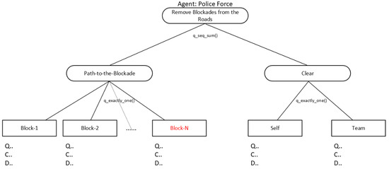 This research focuses on high-level reasoning for PF agents and applies TAEMS modeling to enable task planning and scheduling within the testbed. As demonstrated in prior work [32,33], hierarchical task decomposition with interdependent relationships [31], combined with quantitative modeling of outcome uncertainties in Quality, Cost, and Duration, supports coordinated collaboration while integrating seamlessly with each agent’s local planning and scheduling processes. Through this modeling and reasoning framework, PF agents in the RCRS testbed can effectively prioritize tasks to achieve the optimal combination of outcomes.