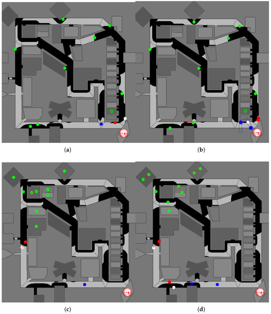 Figure 8. Four simulation maps: (a) Config1: scattered civilians with nearby rescue agents (1 PF, 1 AT, 1 FB) (b) Config 2: scattered civilians with nearby rescue agents (2 PF, 2 AT, 2 FB). (c) Config 3: nearby civilians with scattered rescue agents (1 PF, 1 AT, 1 FB). (d) Config 4: nearby civilians with scattered rescue agents (2 PF, 2 AT, 2 FB). - Configuration 2 (Figure 8b): Same civilian distribution as Configuration 1, but with two agents of each type. This setting tests coordination among multiple homogeneous agents of the same role.