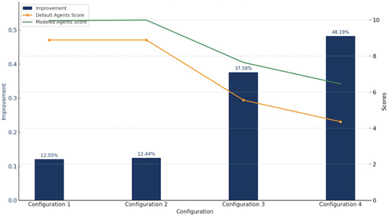 A performance comparison between default and proposed agents across the four configurations is presented in Table 2 and Figure 9. Each reported score corresponds to a single deterministic run; owing to the fully deterministic nature of the RCRS simulator, map, initial positions, and agent implementations, identical configurations always yield identical outcomes.