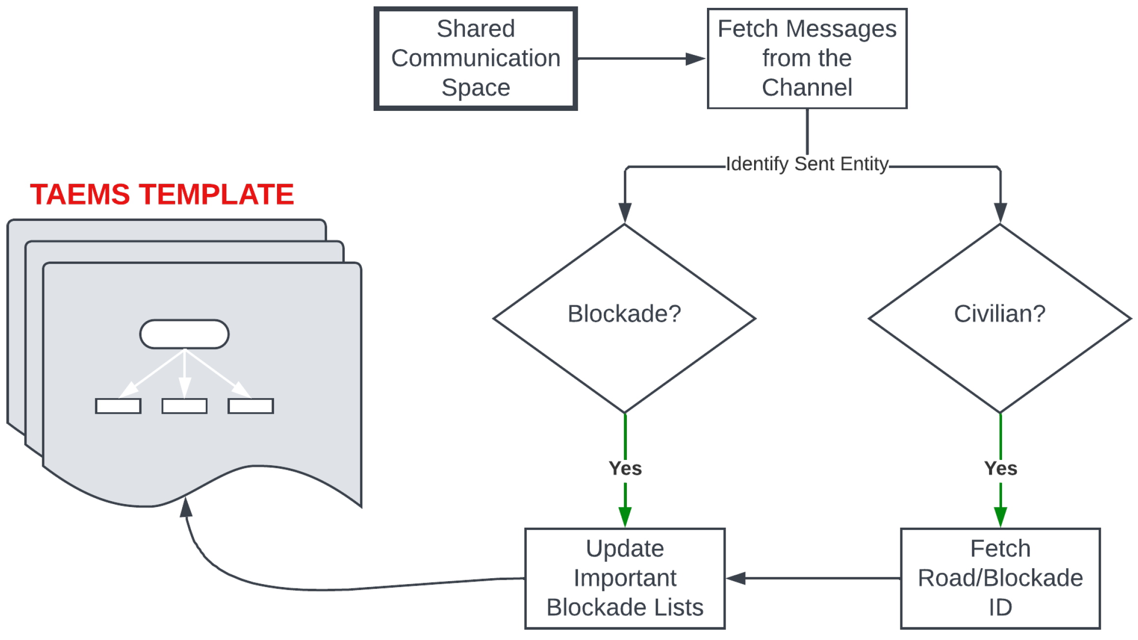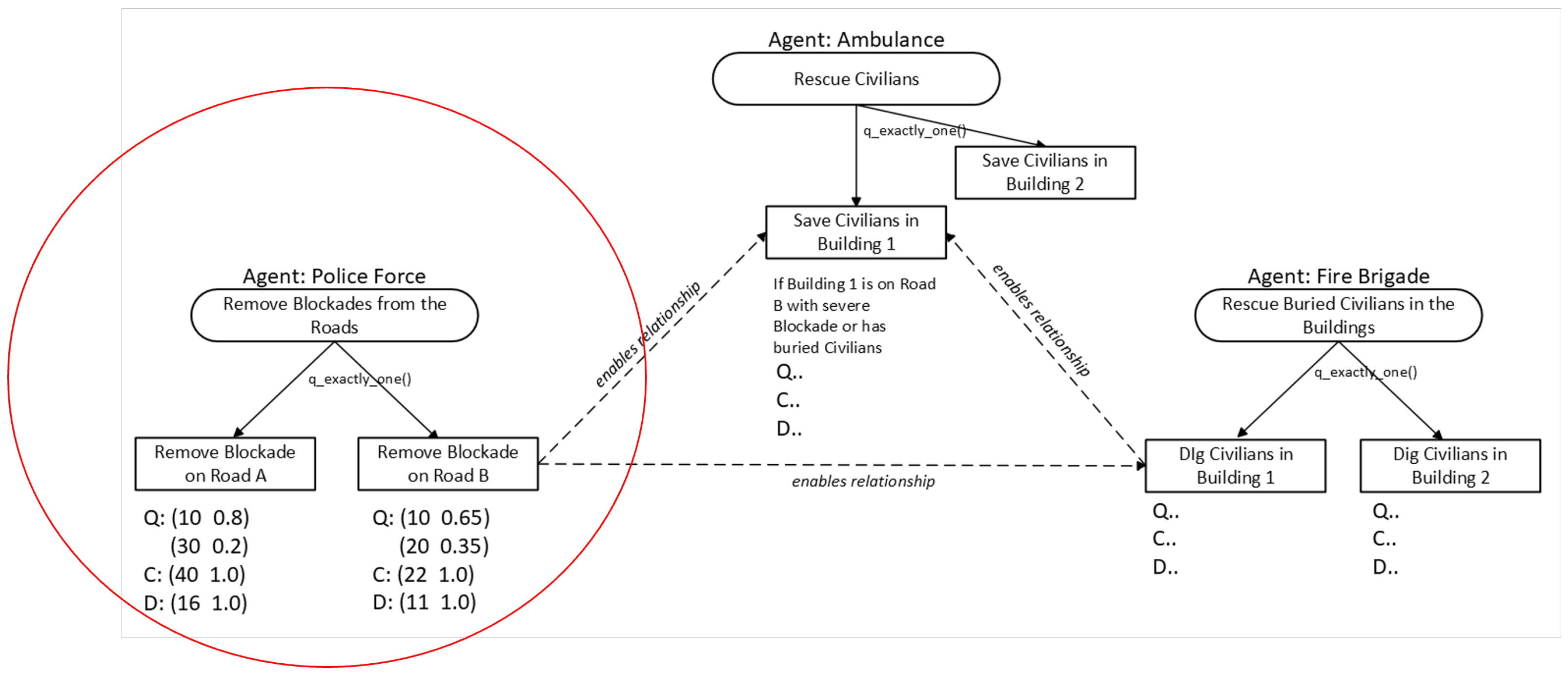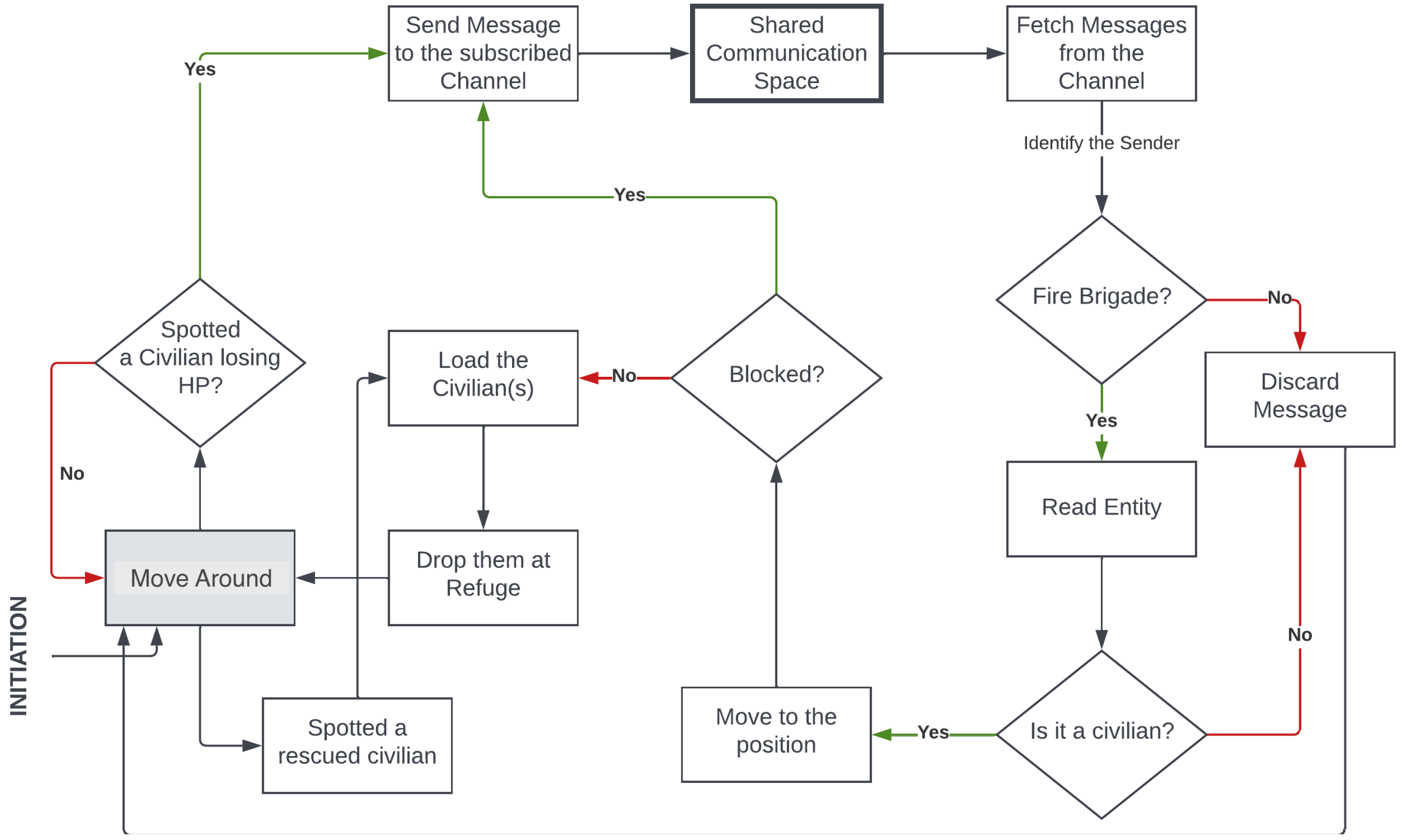 - Upon receiving a voice message from an FB agent announcing a newly rescued civilian, the AT agent navigates to that location. If the path is clear, the civilian is transported to the refuge; otherwise, the obstructing blockade entity is broadcast.
