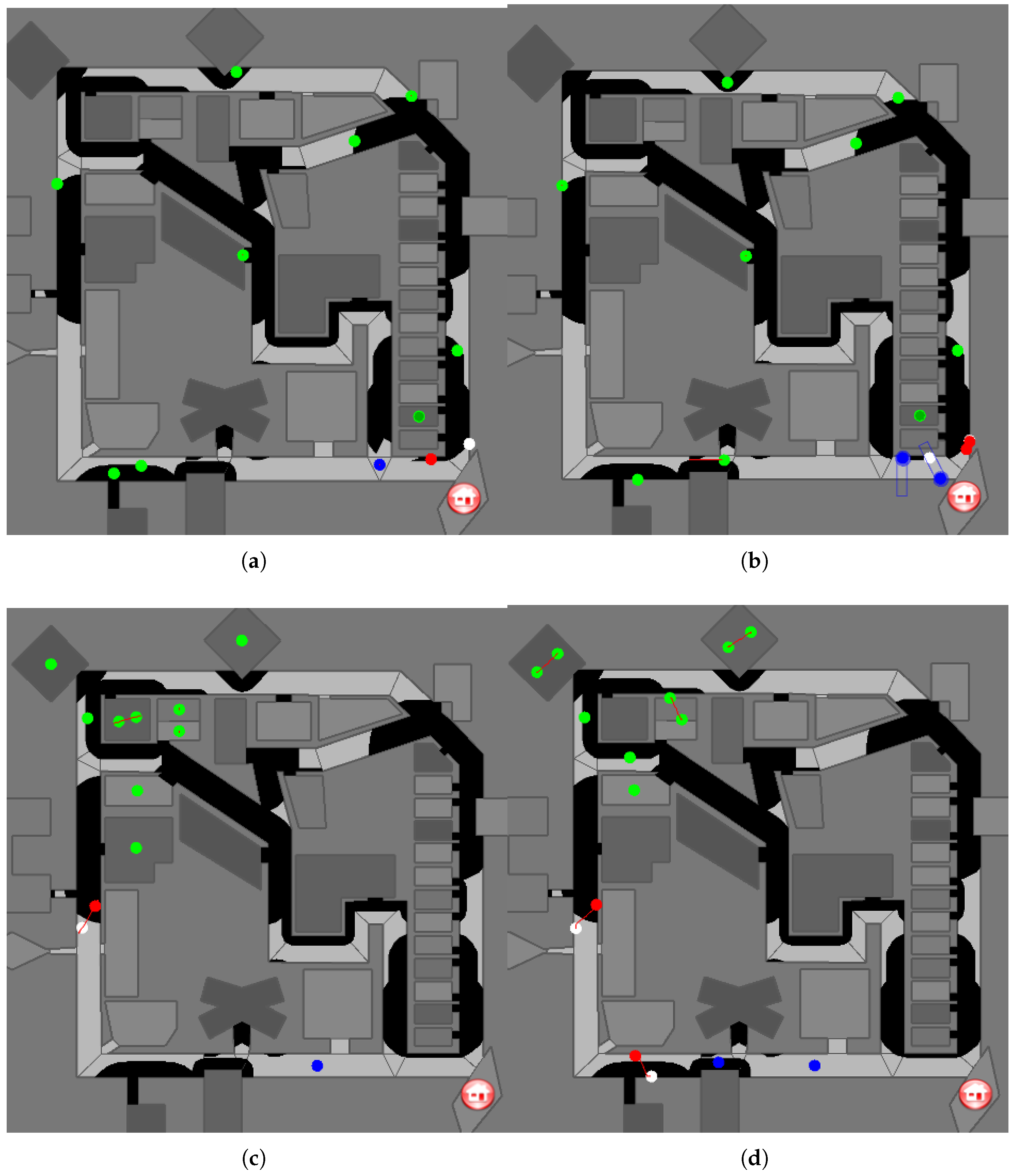 - Configuration 4 (Figure 8d): Same civilian clustering as Configuration 3, but with two agents of each type. The increased travel distances cause civilians to accumulate more damage before rescue, raising overall difficulty.