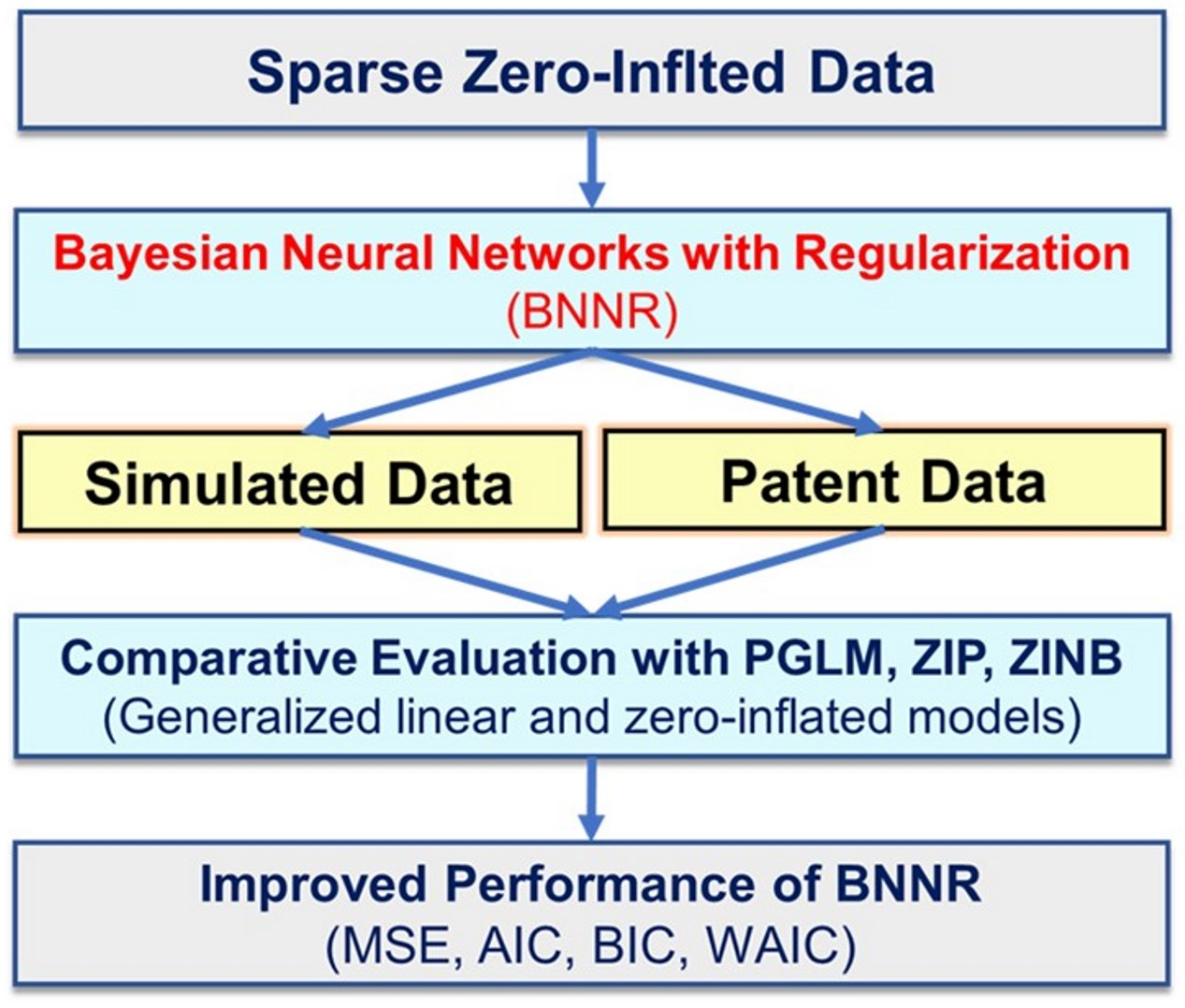 In this study, we operationally regard a zero ratio ≥ 10% as excessive zeros. Because the appropriate threshold can be domain-dependent, we also report results across multiple zero ratio levels to assess robustness. The method is an approach intended to solve problems when the zero ratio is very large and analysis is difficult even with existing zero-inflated models. Since the BNNR method is a model that adds regularization to a BNN, we first describe the structure of the BNN. The proposed BNNR is implemented by an R package for Bayesian regularization in feed-forward neural networks [