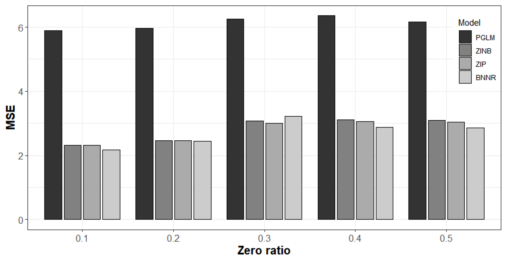 are the actual and predicted values, respectively. To calculate the MSE, we divide the given data into training and test sets with a ratio of 7:3. We build the model using training data and calculate the MSE using the test data. The smaller the MSE value of the model, the better the predictive performance of the model. In the following sections, we compare the performance of four models, PGLM, ZIP, ZINB, and BNNR, using AIC, BIC, and MSE. For the experiments in this paper, we use the R Project for Statistical Computing as a data analysis tool [