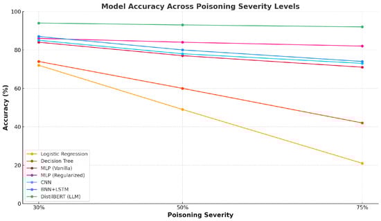 All accuracy values for the BNN+LSTM correspond to the average of five runs, with variance remaining below 1.8 percentage points across poisoning severities, confirming consistent robustness despite stochastic sampling effects. For traditional classifiers, Logistic Regression drops the most. When the poisoning ratio is 30%, the accuracy is about 72%, but when the poisoning ratio is 75%, it decreases quickly to less than 20%. Decision Tree also shows large degradation, when the poisoning ratio is highest, the accuracy goes down to below 45%. Compared with them, neural networks show stronger robustness. Both vanilla MLP and regularized MLP keep accuracy above 70% even when poisoning is severe, and the regularized version always performs better than the vanilla one, which proves the stabilizing effect of dropout and weight decay. CNN shows similar results with MLP, only medium level of degradation under different poisoning ratios. The hybrid model and the Transformer-based model show the best robustness. BNN+LSTM keeps the accuracy above 80% when poisoning ratio increases, showing the advantage of uncertainty modeling. DistilBERT with LoRA fine-tuning performs the best, even when the poisoning ratio is highest, the accuracy is still above 85%, with the least degradation. In general, shallow statistical models are more vulnerable under data poisoning, while deep neural networks with regularization, probabilistic hybrid models, and large-scale pre-trained Transformer architectures show significantly stronger robustness.