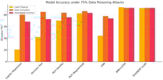 In this section we select 75% poisoning level as a representative case to analyze model robustness. Figure 3 shows model accuracy under this level for three attack types: label flipping, data corruption, and adversarial insertion. The grouped bar chart provides a direct comparison of all model architectures under the same poisoning condition. For traditional models, Logistic Regression drops below 25% accuracy under label flipping and around 45% under data corruption. Decision Tree shows higher values but still decreases to about 40% under label flipping. For neural models, Vanilla MLP keeps accuracy between 70% and 80% across the three attack types. Regularized MLP achieves slightly higher results, indicating the effect of dropout and weight decay. CNN maintains relatively high accuracy under data corruption and adversarial insertion, but falls to around 45% when labels are flipped. For hybrid and Transformer-based models, BNN+LSTM remains above 85% across all three attacks. DistilBERT with LoRA fine-tuning shows the highest performance, close to 90% in all cases, with small variation between attack types. These results indicate that label flipping causes the most severe degradation, especially for shallow models, while architectures with regularization, probabilistic components, or pre-trained attention maintain higher robustness under severe poisoning.