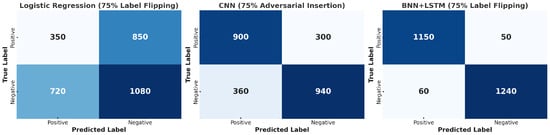 To provide an architecture-aware comparison, each confusion matrix in Figure 4 corresponds to the attack type that most strongly exposes the respective model’s vulnerability—label flipping for Logistic Regression and BNN+LSTM, and adversarial insertion for CNN. This mixed-condition design highlights architecture-specific degradation patterns rather than enforcing uniformity across all attack types. Figure 4 shows the confusion matrices under high level poisoning. Logistic Regression under 75% label flipping has serious polarity collapse. When there are 1200 positive samples, only 350 are correct and 850 are wrong as negative. When there are 1800 negative samples, 1080 are correct and 720 are wrong as positive. CNN under 75% adversarial insertion keeps better balance but still clear confusion. There are 900 positive correct and 300 wrong, 940 negative correct and 360 wrong. In contrast, BNN+LSTM under 75% label flipping keeps robustness. Out of 1165 positive samples, 1115 are correct and about 50 are wrong. Out of 1300 negative samples, 1240 are correct and about 60 are wrong. These results show shallow models like Logistic Regression collapse quickly, while hybrid models with probabilistic mechanism like BNN+LSTM still keep balanced predictions under extreme attack.
