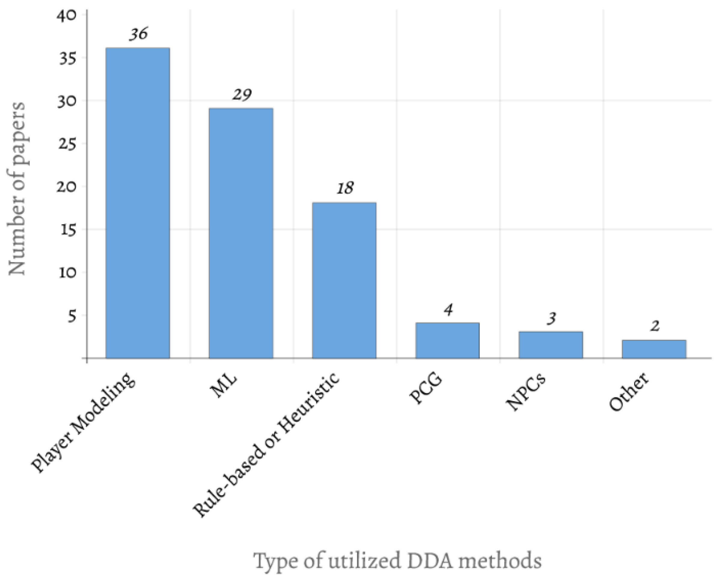 - The details regarding the discussed DDA methods, which were classified into different categories. Specifically, they were distributed into the groups: “player modeling,” covering various player modeling and assessment approaches; “machine learning (ML),” for systems incorporating ML-based technologies; “rule-based or heuristic” approaches; “procedural content generation (PCG)” technologies; “NPCs” for DDA systems utilizing non-player characters (NPCs); and “other”, for specialized systems not fitting into the previous groups.